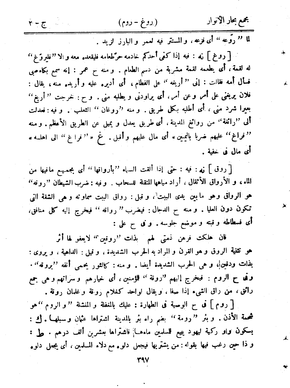 [روم] في ح الوصية في الطهارة: عليك بالمغفلة والمنشلة "والروم" هو شحمة الأذن. وبئر "رومة" بضم راء بئر بالمدينة اشتراها عثمان وسبلها. ك: بسكون واو ركية ليهود يبيع للمسلمين ماءها فاشتراها بعشرين ألف درهم. ط: وذا حين رغب فيها بقوله: من يشتريها فيجعل دلوه مع دلاء المسلمين، أي يجعل دلوه