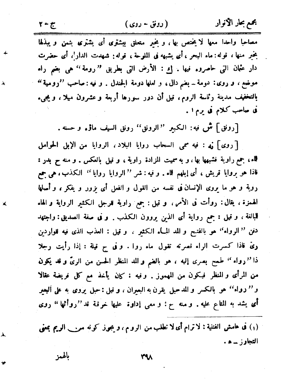مصاحبًا واحدًا معها لا يختص بها، وبخير متعلق بيشتري أي يشتري بثمن ويبذلها بخير منها، قوله: ماء البحر، أي يشبهه في الملوحة، قوله: شهدت الدار أي حضرت دار عثمان التي حاصروه فيها. ك: الأرض التي بطريق "رومة" هي بضم راء موضع، وروى: دومة - بضم دال، ولعلها دومة الجندل. وفيه: صاحب "رومية" بالتخفيف مدينة رئاسة الروم، قيل أن دور سورها أربعة وعشرون ميلًا، ويجيء في صاحب كلام في يرم.