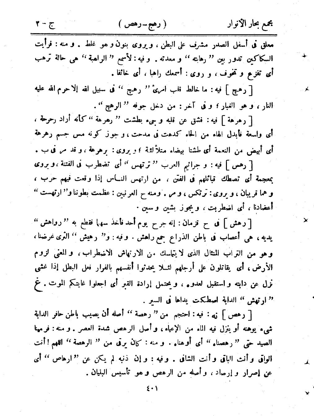 [رهش] في ح قزمان: إنه جرح يوم أحد فأخذ سهمًا فقطع به "رواهش" يديه، هي أعصاب في باطن الذراع جمع راهش. وفيه: و"رهيش" الثرى غرضنا، وهو من التراب المنثال الذي لا يتماسك من الارتهاش الاضطراب، والمعنى لزوم ارض، أي يقاتلون على أرجلهم لئلا يحدثوا أنفسهم بالفرار فعل البطل إذا غشي نزل عن دابته واستقبل لعدوه، ويحتمل إرادة القبر أي اجعلوا غايتكم الموت. غ "ارتهش" الدابة اصطكت يداها في السير.