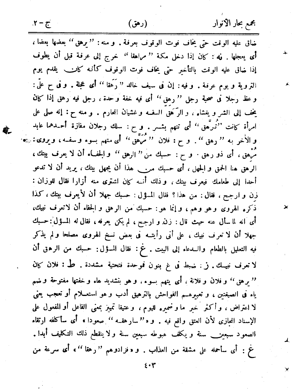 ضاق عليه الوقت حتى يخاف فوت الوقوف بعرفة. ومنه: "يرهق" بعضها بعضًا، أي يعجلها. نه: كان إذا دخل مكة "مراهقًا" خرج إلى عرفة قبل أن يطوف إذا ضاق عليه الوقت بالتأخير حتى يخاف فوت الوقوف كأنه كان يقدم يوم التروية ويوم عرفة. وفيه: إن في سيف خالد "رهقا" أي عجلة. وفي ح عليّ: وعظ رجلًا في صحبة رجل "رهق" أي فيه خفة وحدة، رجل فيه رهق إذا كان يخف إلى الشر ويغشاه، والرهق السفه وغشيان المحارم. ومنه ح: إنه صلى على امرأة كانت "تُرهق" أي تتهم بشر. وح: سلك رجلان مفازة أحدهما عابد الآخر به "رهق". وح: فلان "مُرهق" أي متهم بسوء وسفه، ويروي: مرهق، أي ذو رهق. وح: حسبك من "الرهق" والجفاء أن لا يعرف بيتك، الرهق هنا الحمق والجهل، أي حسبك من هذا أن يجهل بيتكن يريد أن لا تدعو أحدًا إلى طعامك فيعرف بيتك، وذلك أنه كان اشترى منه أزارًا فقال للوزان: زن وارجح، فقال: من هذا؟ فقال المسؤل: حسبك جهلًا أن لا يعرف بيتك، كذا ذكره الهروي وهو وهم، وإنما هو: حسبك من الرهق والجفاء أن لا تعرف نبيك، أي أنه لما سأل عنه حيث قال: زن وارجح، لم يكن يعرفه، فقال له المسؤل: حسبك جهلًا أن لا تعرف نبيك، على أني رأيته في بعض نسخ الهروي مصلحًا ولم يذكر فيه التعليل بالطعام والدعاء إلى البيت. غ: فقال المسؤل: حسبك من الرهق أن لا تعرف نبيك. ز: ضبط في غ بنون فموحدة فتحتية مشددة. ط: فلان كان "يرهق" وفلان وفلانة، أي يتهم بسوء، وهو بتشديد هاء وخفتها مفتوحة وضم ياء في الصيغتين، وتعبيرهم الفواحش بالترهيق أدب وهو استعلام أو تعجب يعني لا اعتراض، وأكثر خبر ما وضميره لليوم، وعتيقًا تمييز بمعنى الفاعل أو المفعول على الإسناد المجازي لأن العتق واقع فيه. و""سأرهقه" صعودا" أي سأكلفه ارتقاء الصعود سبعين سنة ويكلف هبوطه سبعين سنة ولا ينقطع ذلك التكليف أبدا. غ: أي سأحمله على مشقة من العذاب. و"فزادوهم "رهقا"" أي سرعة من