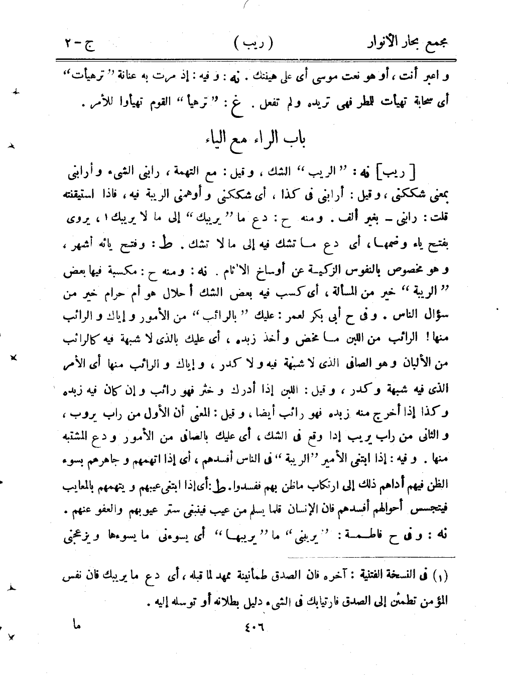 [ريب] نه: "الريب" الشك، وقيل: مع التهمة، رابني الشيء وأرابني بمعنى شككني، وقيل: أرابني في كذا، أي شككني وأوهمني الريبة فيه، فإذا استيقنته قلت: رابني - بغير ألف. ومنه ح: دع ما "يريبك" إلى ما لا يريبك، يروى بفتح ياء وضمها، أي دع ما تشك فيه إلى مالا تشك. ط: وفتح يائه أشهر، وهو مخصوص بالنفوس الزكية عن أوساخ الآثام. نه: ومنه ح: مكسبة فيها بعض "الريبة" خير من المسألة، أي كسب فيه بعض الشك أحلال هو أم حرام خير من سؤال الناس. وفي ح أبي بكر لعمر: عليك "بالرائب" من الأمور وإياك والرائب منها! الرائب من اللبن ما مخض وأخذ زبده، أي عليك بالذي لا شبهة فيه كالرائب من الألبان وهو الصافي الذي لا شبهة فيه ولا كدر، وإياك والرائب منها أي الأمر الذي فيه شبهة وكدر، وقيل: اللبن إذا أدرك وخثر فهو رائب وإن كان فيه زبده وكذا إذا أخرج منه زبده فهو رائب أيضًا، وقيل: المعنى أن الأول من راب يروب، والثاني من راب يريب إذا وقع في الشك، أي عليك بالصافي من الأمور ودع المشتبه منها. وفيه: إذا ابتغى الأمير "الريبة" في الناس أفسدهم، أي إذا اتهمهم وجاهرهم بسوء الظن فيهم أداهم ذلك إلى ارتكاب ما ظن بهم ففسدوا. ط: أي إذا ابتغى عيبهم ويتهمهم بالمعايب فيتجسس أحوالهم أفسدهم فإن الإنسان قلما يسلم من عيب فينبغي ستر عيوبهم والعفو عنهم. نه: وفي ح فاطمة: "يريبني" ما "يريبها" أي يسوءني ما يسوءها ويزعجني