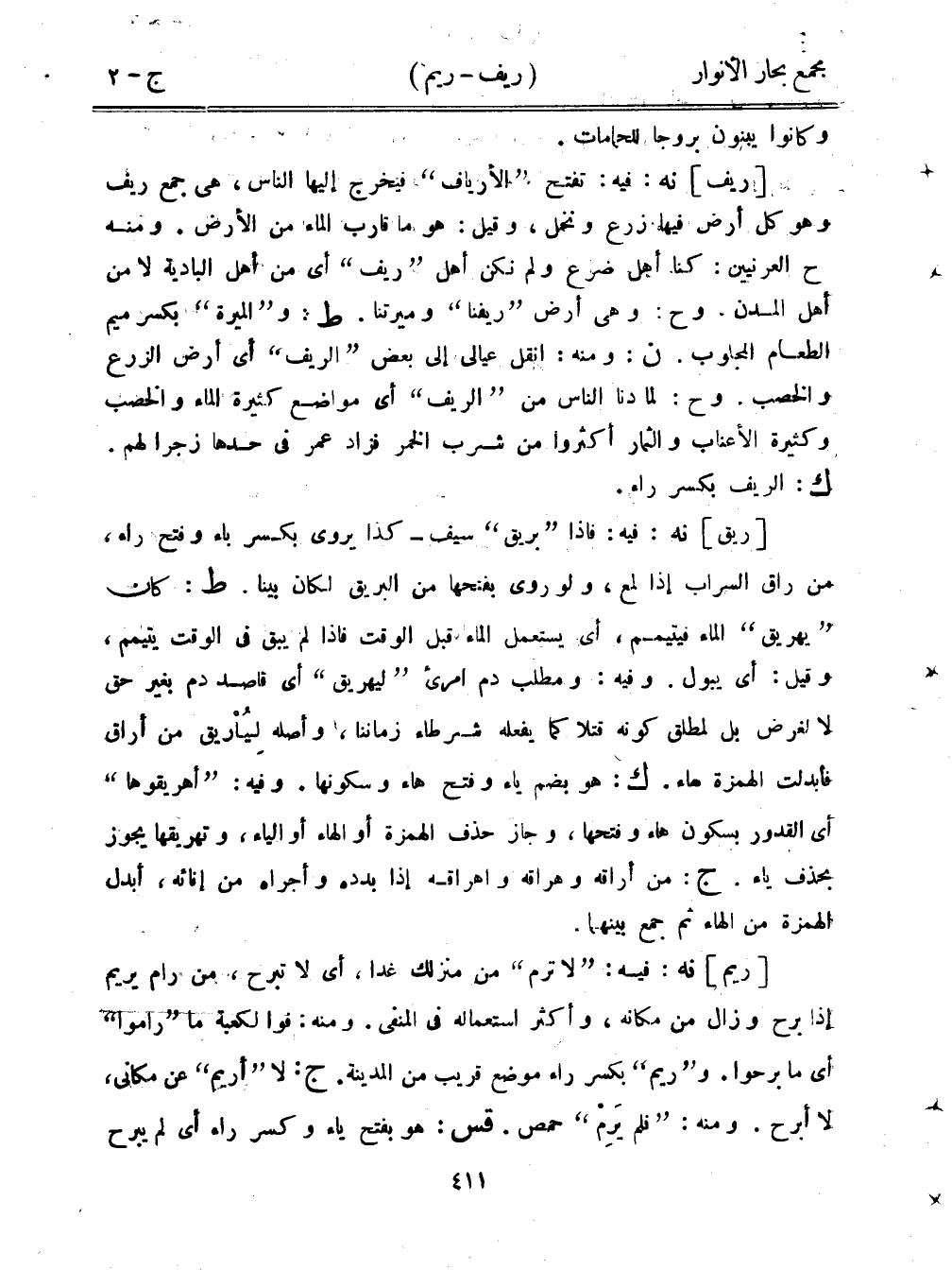[ريق] نه: فيه: فإذا "بريق" سيف - كذا يروى بكسر باء وفتح راء، من راق السراب إذا لمع، ولو روى بفتحها من البريق لكان بينا. ط: كان "يهريق" الماء فيتيمم، أي يستعمل الماء قبل الوقت فإذا لم يبق في الوقت يتيم، وقيل: أي يبول. وفيه: ومطلب دم امرئ "ليهريق" أي قاصد دم بغير حق لا لغرض بل لمطلق كونه قتلًا كما يفعله شرطاء زماننان وأصله لياريق من أراق فأبدلت الهمزة هاء. ك: هو بضم ياء وفتح هاء وسكونها. وفيه: "أهريقوها" أي القدور بسكون هاء وفتحها، وجاز حذف الهمزة أو الهاء أو الياء، وتهريقها يجوز بحذف ياء. ج: من أراقه وهراقه وإهراقه إذا بدده وأجراه من إنائه، أبدل الهمزة من الهاء ثم جمع بينهما.