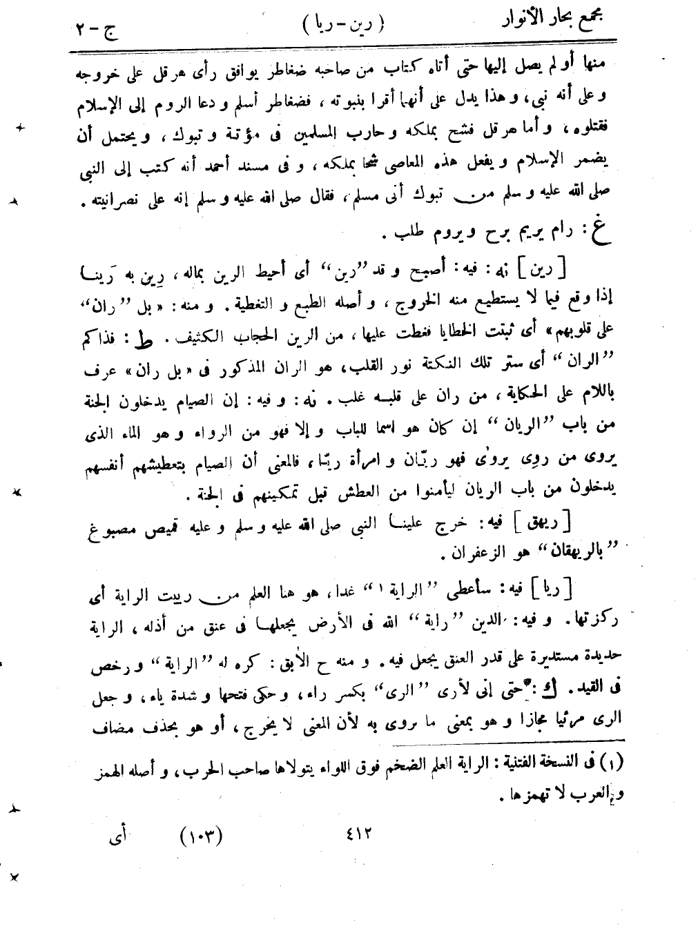 [ريا] فيه: سأعطي "الراية" غدا، هو هنا العلم من رييت الراية أي ركزتها. وفيه: الدين "راية" الله في الأرض يجعلها في عنق من أذله، الراية حديدة مستديرة على قدر العنق يجعل فيه. ومنه ح الآبق: كره له "الراية" ورخص في القيد. ك: حتى إني لأرى "الري" بكسر راء، وحكي فتها وشدة ياء، وجعل الري مرئيا مجازًا وهو بمعنى ما تروى به لأن المعنى لا يخرج، أو هو بحذف مضاف