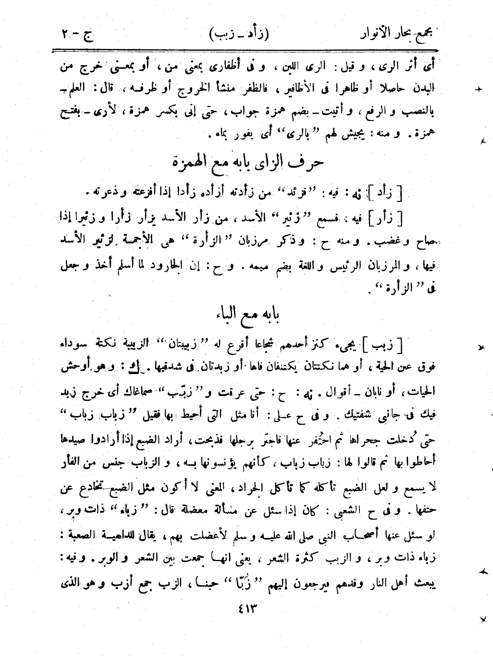 [زبب] يجيء كنز أحدهم شجاعًا أقرع له "زبيبتان" الزبيبة نكتة سوداء فوق عين الحية، أو هما نكتتان يتنفان فاها أو زبدتان في شدقيها. ك: وهو أوحش الحيات، أو نابان - أقوال. نه: ح: حتى عرقت و"زبب" صماغاك أي خرج زبد فيكفي جانبي شفتيك. وفي ح علي: أنا مثل التي أحيط بها فقيل "زباب زباب" حتى دُخلت جحراها ثم احتفر عنها فاجتر برجلها فذبحت، أراد الضبع إذا أرادوا صيدها أحاطوا بها ثم قالوا لها: زباب زباب، كأنهم ؤنسونها به، والزباب جنس من الفأر لا يسمع ولعل الضبع تأكله كما تأكل الجراد، المعنى لا أكون مثل الضبع تخادع عن حتفها. وفي ح الشعبي: كان إذا سئل عن مسألة معضلة قال: "زباء" ذات وبر، لو سئل عنها أصحاب النبي صلى الله عليه وسلم لأعضلت بهم، يقال للداهية الصعبة: زباء ذات وبر، والزبب كثرة الشعر، يعني أنها جمعت بين الشعر والوبر. وفيه: يبعث أهل النار وفدهم فيرجعون إليهم "زبا" حبنا، الزب جمع أزب وهو الذي