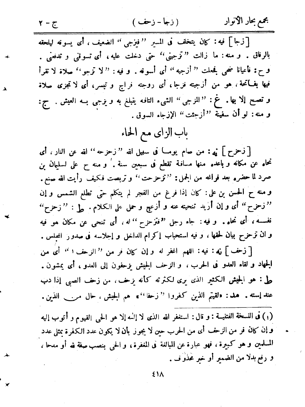 [زحف] نه: فيه: اللهم اغفر له وإن كان فر من "الزحف" أي من الجهاد ولقاء العدو في الحرب، والزحف الجيش يزحفون إلى العدو، أي يمشون. ط: هو الجيش الكثير الذي يرى لكثرته كأنه يزحف، من زحف الصبي إذا دب عند إسته. مد: "لقيتم الذين كفروا "زحفًا"" هم الجيش، حال من الذين