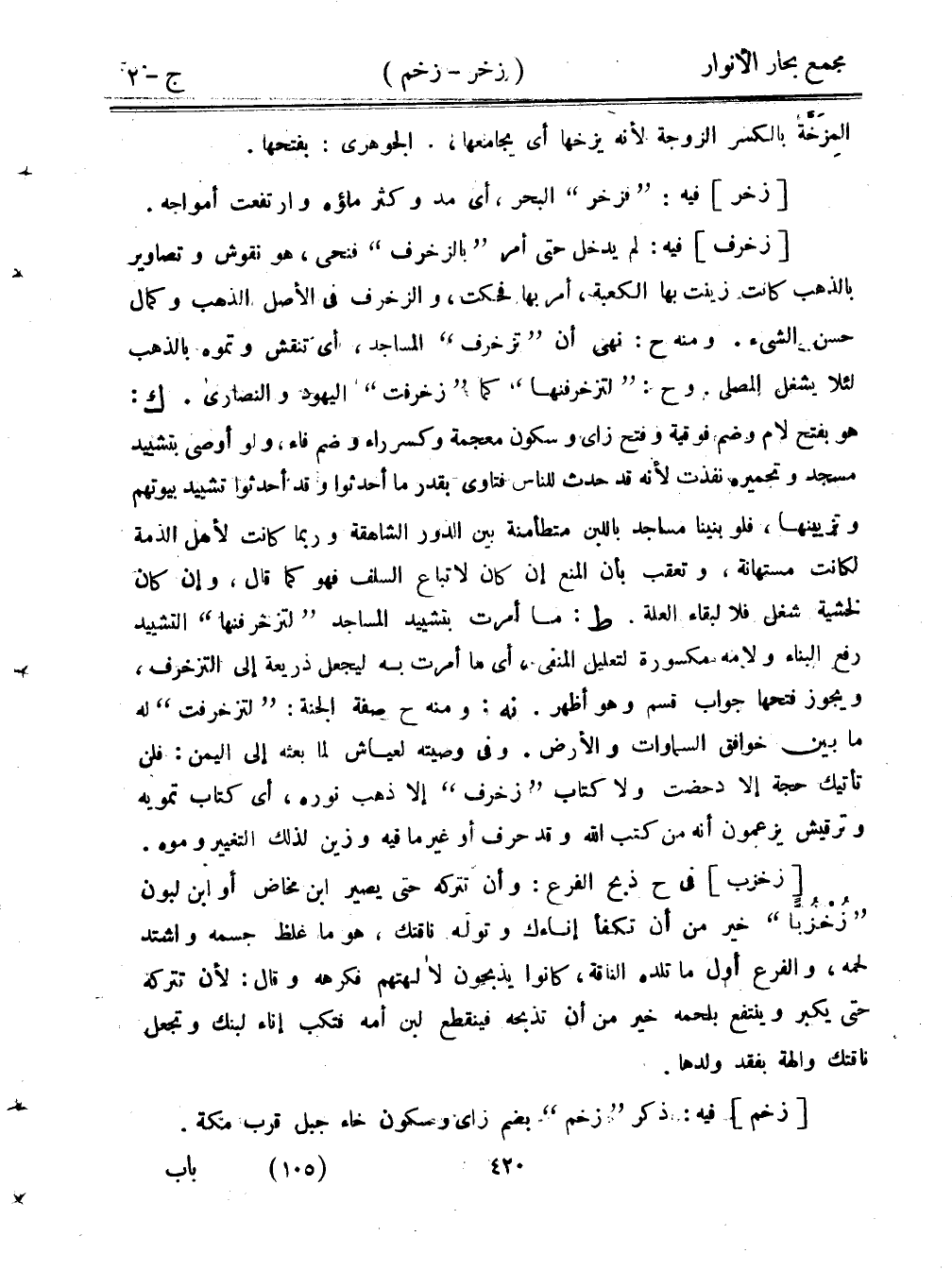 [زخرف] فيه: لم يدخل حتى أمر "بالزخرف" فنحى، هو نقوش وتصاوير بالذهب كانت زينت بها الكعبة، أمر بها فحكت، والزخرف في الأصل الذهب وكمال حسن الشيء. ومنه ح: نهى أن "تزخرف" المساجد، أي تنقش وتموه بالذهب لئلا يشغل المصلى. وح: لتزخرفنها" كما "زخرفت" اليهود والنصارى. ك: هو بفتح لام وضم فوقية وفتح زاي وسون معجمة وكسر راء وضم فاء، ولو أوصى بتشييد مسجد وتحميره نفذت لأنه قد حدث للناس فتاوى بقدر ما أحدثوا وقد أحدثوا تشييد بيوتهم وتزيينها، فلو بنينا مساجد باللبن متطأمنة بين الدور الشاهقة وربما كانت لأهل الذمة لكانت مستهانة، وتعقب بأن المنع إن كان لاتباع السلف فهو كما قال، وإن كان لخشية شغل فلا لبقاء العلة. ط: ما أمرت بتشييد المساجد "لتزخرفنها" التشييد رفع البناء ولامه مكسورة لتعليل المنفي، أي ما أمرت به ليجعل ذريعة إلى التزخرف، ويجوز فتحها جواب قسم وهو أظهر. نه. ومنه ح صفة الجنة: "لتزخرفت" له ما بين خوافق السماوات والأرض. وفي وصيته لعياش لما بعثه إلى اليمن: فلن تأتيك حجة إلا دحضت ولا كتاب "زخرف" إلا ذهب نوره، أي كتاب تمويه وترقيش يزعمون أنه من كتب الله وقد حرف أو غير ما فيه وزين لذلك التغيير وموه.