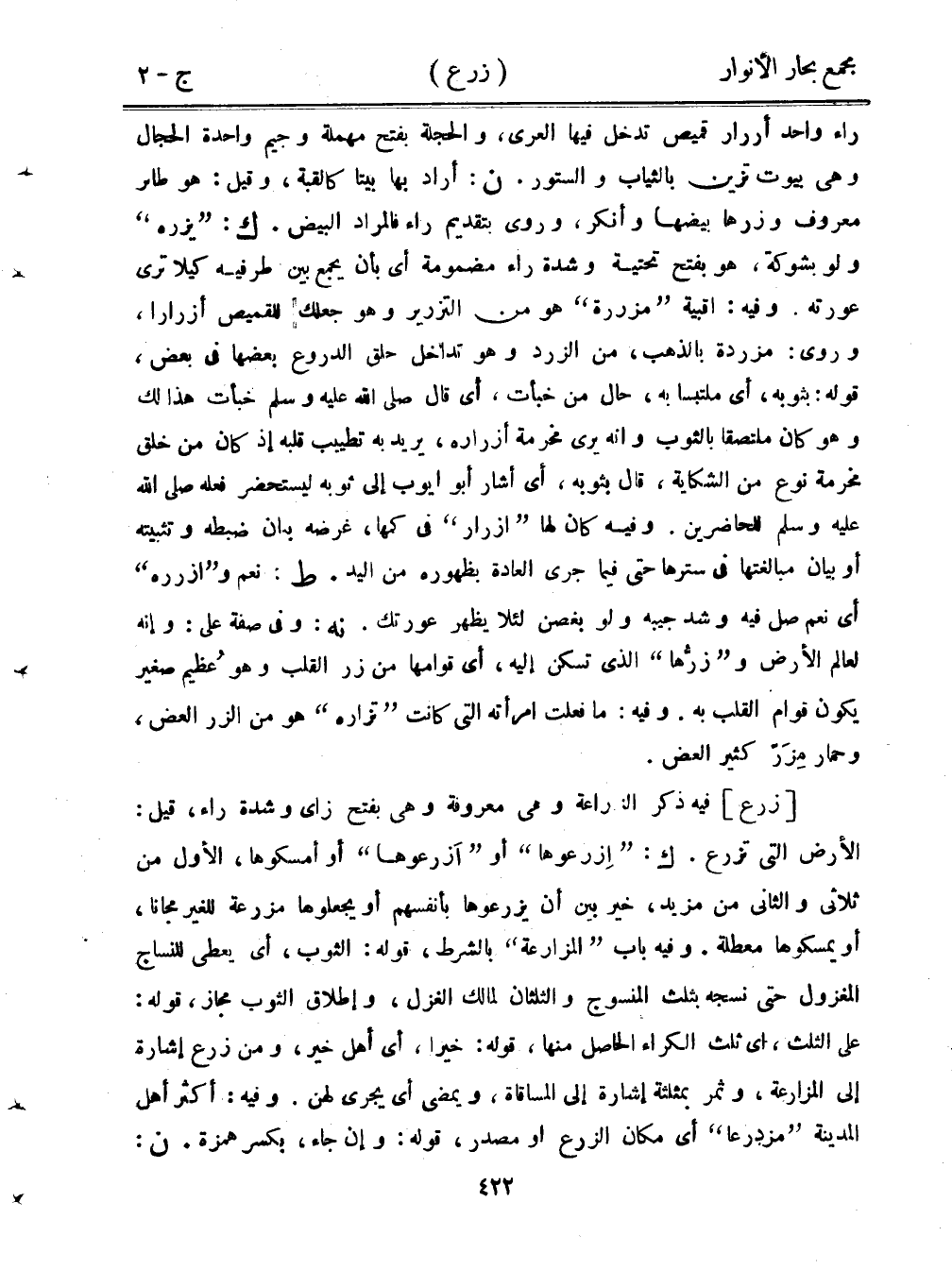 [زرع] فيه ذكر الزراعة وهي معروفة وهي بفتح زاي وشدة راء، قيل: الأرض التي تزرع. ك: "ازرعوها" أو "ازرعوها" أو أمسكوها، الأول من ثلاثي والثاني من مزيد، خير بين أن يزرعوها بأنفسهم أويجعلوها مزرعة للغير مجانًا، أو يمسكوها معطلة. وفيه باب "المزارعة" بالشرط، قوله: الثوب، أي يعطي للنساج المغزول حتى نسجه بثلث المنسوج والثلثان لمالك الغزل، وإطلاق الثوب مجاز، قوله: على الثلث، أيثلث الكراء الحاصل منها، قوله: خيرًا، أي أهل خير، ومن زرع إشارة إلى المزارعة، وثمر بمثلثة إشارة إلى المساقاة، ويمضي أي يجري لهن. وفيه: أكثر أهل المدينة "مزدرعا" أي مكان الزرع أو مصدر، قوله: وإن جاء، بكسر همزة. ن:
