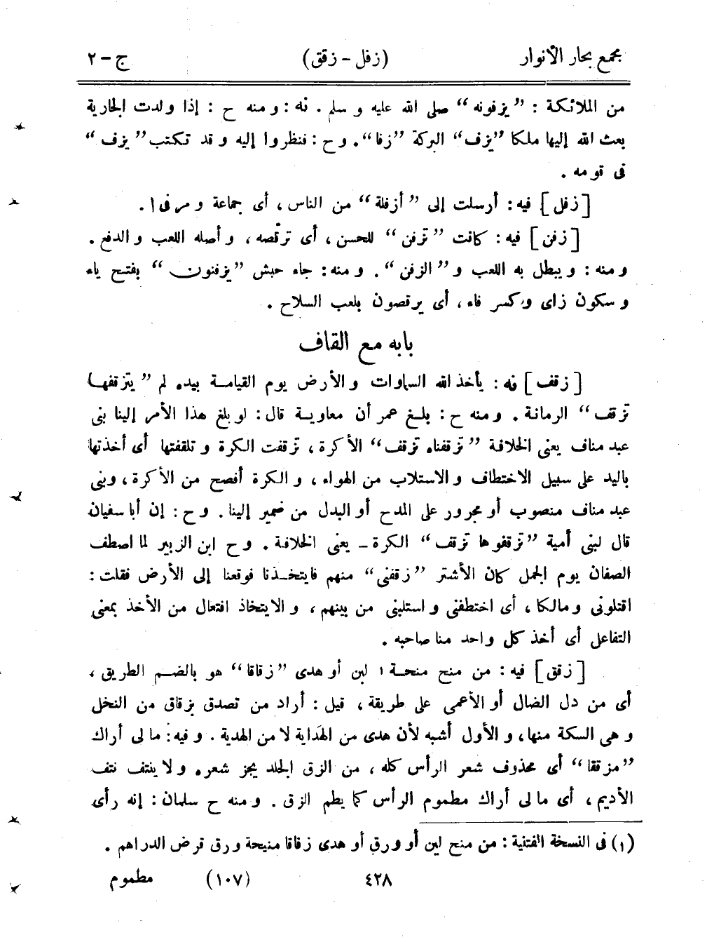 [زفف] نه: يأخذ الله السماوات والأرض يوم القيامة بيده لم "يتزقفها تزقف" الرمانة. ومنه ح: بلغ عمر أن معاوية قال: لو بلغ هذا الأمر إلينا بني عبد مناف يعني الخلافة "تزقفناه تزقف" الأكرة، تزقفت الكرة وتلقفتها أي أخذتها باليد على سبيل الاختطاف ولاستلاب من الهواء، والكرة أفصح من الأكرة، وبني عبد مناف منصوب أو مجرور على المدح أو البدل من ضمير إلينا. وح: إن أبا سفيان قال لبني مية "تزقفوها تزقف" الكرة - يعني الخلافة. وح ابن الزبير لما اصطف الصفان يوم الجمل كان الأشتر "زقفني" منهم فايتخذنا فوقعنا إلى الأرض فقلت: اقتلوني ومالكًا، أي اختطفني واستلبني من بينهم، وألا يتخاذ افتعال من الأخذ بمعنى التفاعل أي أخذ كل واحد منا صاحبه.