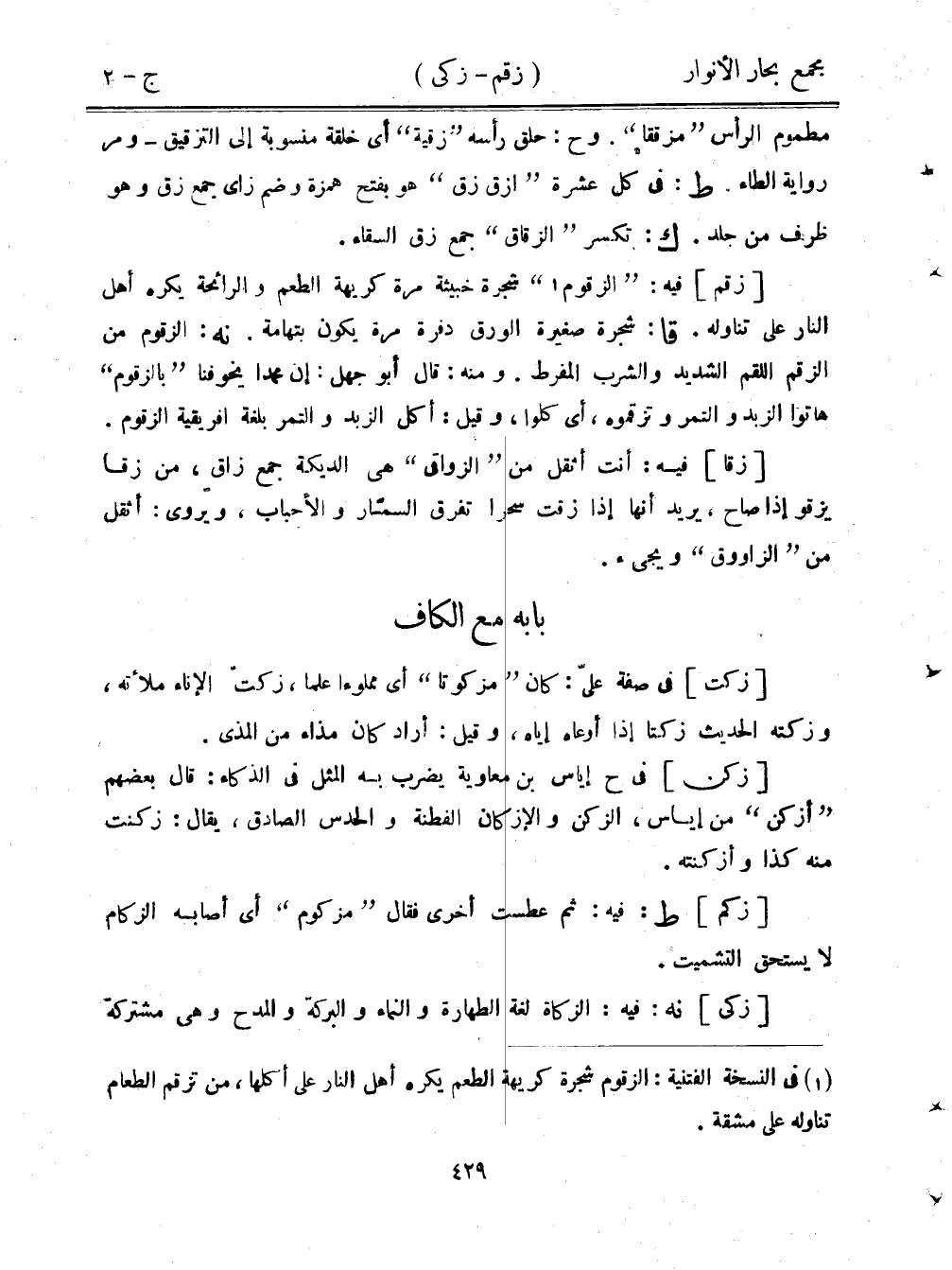 مطموم الرأس "مزقفا". وح: حلق رأسه "زقية" أي خلقة منسوبة إلى التزقيق - ومر رواية الطاء. ط: في كل عشرة "ازق زق" هو بفتح همزة وضم زاي جمع زق وهو ظرف من جلد. ك: تكسر "الزقاق" جمع زق السقاء.