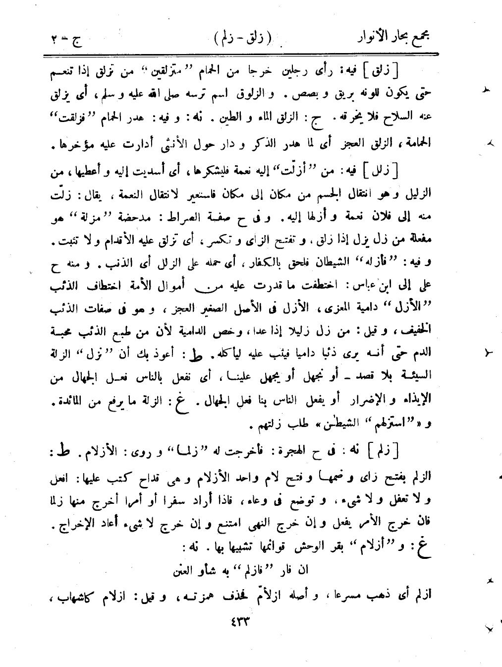 [زلل] فيه: من "أزلت" إليه نعمة فليشكرها، أي أسديت إليه وأعطيها، من الزليل وهو انتقال الجسم من مكان إلى مكان فاستعير لانتقال النعمة، يقال: زلت منه إلى فلان نعمة وأزلها إليه. وفي ح صفة الصراط: مدحضة "مزلة" هو مفعلة من زل يزل إذا زلق، وتفتح الزاي وتكسر، أي تزلق عليه الأقدام ولا تثبت. وفيه: "فأزله" الشيطان فلحق بالكفار، أي حمله على الزلل أي الذنب. ومنه ح على إلى ابن عباس: اختطفت ما قدرت عليه من أموال الأمة اختطاف الذئب "الأزل" دامية المعزى، الأزل في الأصل الصغير العجز، وهو في صفات الذئب الخفيف، وقيل: من زل زليلًا إذا عدا، وخص الدامية لأن من طبع الذئب محبة الدم حتى أنه يرى ذئبًا داميًا فيثب عليه ليأكله. ط: أعوذ بك أن "نزل" الزلة السيئة بلا قصد- أو تجهل أو يجهل علينا، أي نفعل بالناس فعل الجهال من الإيذاء والإضرار أو يفعل الناس بنا فعل الجهال. غ: الزلة ما يرفع من المائدة. و"استزلهم" الشيطان" طلب زلتهم.
