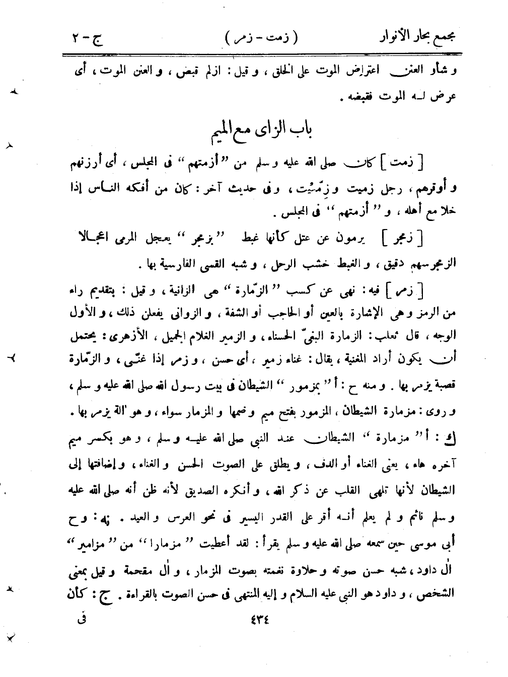 [زمر] فيه: نهى عن كسب "الزمارة" هي الزانية، وقيل: بتقديم راء من الرمز وهي الإشارة بالعين أو الحاجب أو الشفة، والزواني يفعلن ذلك، والأول الوجه، قال ثعلب: الزمارة البغي الحسناء، والزمير الغلام الجميل، الأزهري: يحتمل أن يكون أراد المغنية، يقال: غناء زمير، أي حسن، وزمر إذا غنى، والزمارة قصبة يزمر بها. ومنه ح: أ "بمزمور" الشيطان في بيت رسول الله صلى الله عليه وسلم، وروى: مزمارة الشيطان، المزمور بفتح ميم وضمها والمزمار سواء، وهو "آلة يزمر بها. ك: أ "مزمارة" الشيطان عند النبي صلى الله عليه وسلم، وهو بكسر ميم آخره هاء، يعني الغناء أو الدف، ويطلق على الصوت الحسن والغناء، وإضافتها إلى الشيطان لأنها تلهي القلب عن ذكر الله، وأنكره الصديق لأنه ظن أنه صلى الله عليه وسلم قائم ولم يعلم أنه أقر على القدر اليسير في نحو العرس والعيد. نه: وح أبي موسى حين سمعه صلى الله عليه وسلم يقرأ: لقد أعطيت "مزمارًا" من "مزامير" أل داود، شبه حسن صوته وحلاوة نغمته بصوت المزمار، وأل مقحمة وقيل بمعنى الشخص، وداود هو النبي عليه السلام وإليه المنتهي في حسن الصوت بالقراءة. ج: كأن
