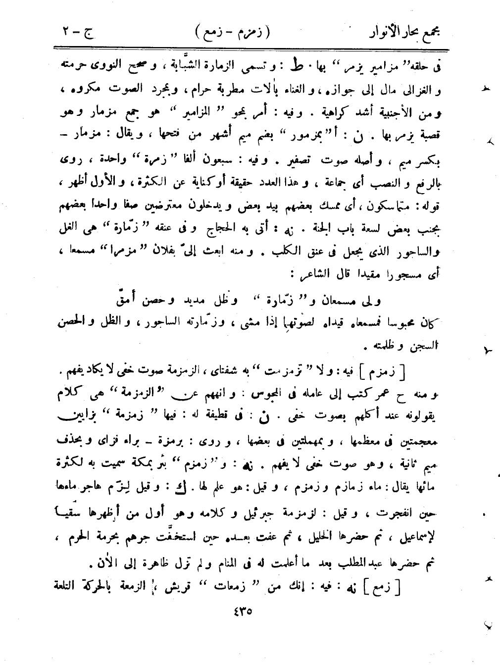 في حلقه "مزامير يزمر" بها. ط: وتسمى الزمارة الشبابة، وصحح النووي حرمته والغزالي مال إلى جوازه، والغناء بآلات مطرية حرام، وبمجرد الصوت مكروه، ومن الأجنبية أشد كراهية. وفيه: أمر بمحو "المزامير" هو جمع مزمار وهو قصبة يزمر بها. ن: أ "بمزمور" بضم ميم أشهر من فتحها، ويقال: مزمار - بكسر ميم، وأصله صوت تصفير. وفيه: سبعون ألفًا "زمرة" واحدة، روى بالرفع والنصب أي جماعة، وهذا العدد حقيقة أو كناية عن الكثرة، والأول أظهر، قوله: متماسكون، أي ممسك بعضهم بيد بعض ويدخلون معترضين صفا واحدًا بعضهم بجنب بعض لسعة باب الجنة. نه: أتى به الحجاج وفي عنقه "زمارة" هي الغل والساحور الذي يجعل في عنق الكلب. ومنه ابعث إليّ بفلان "مزمرا" مسمعا، أي مسجورا مقيدًا قال الشاعر: