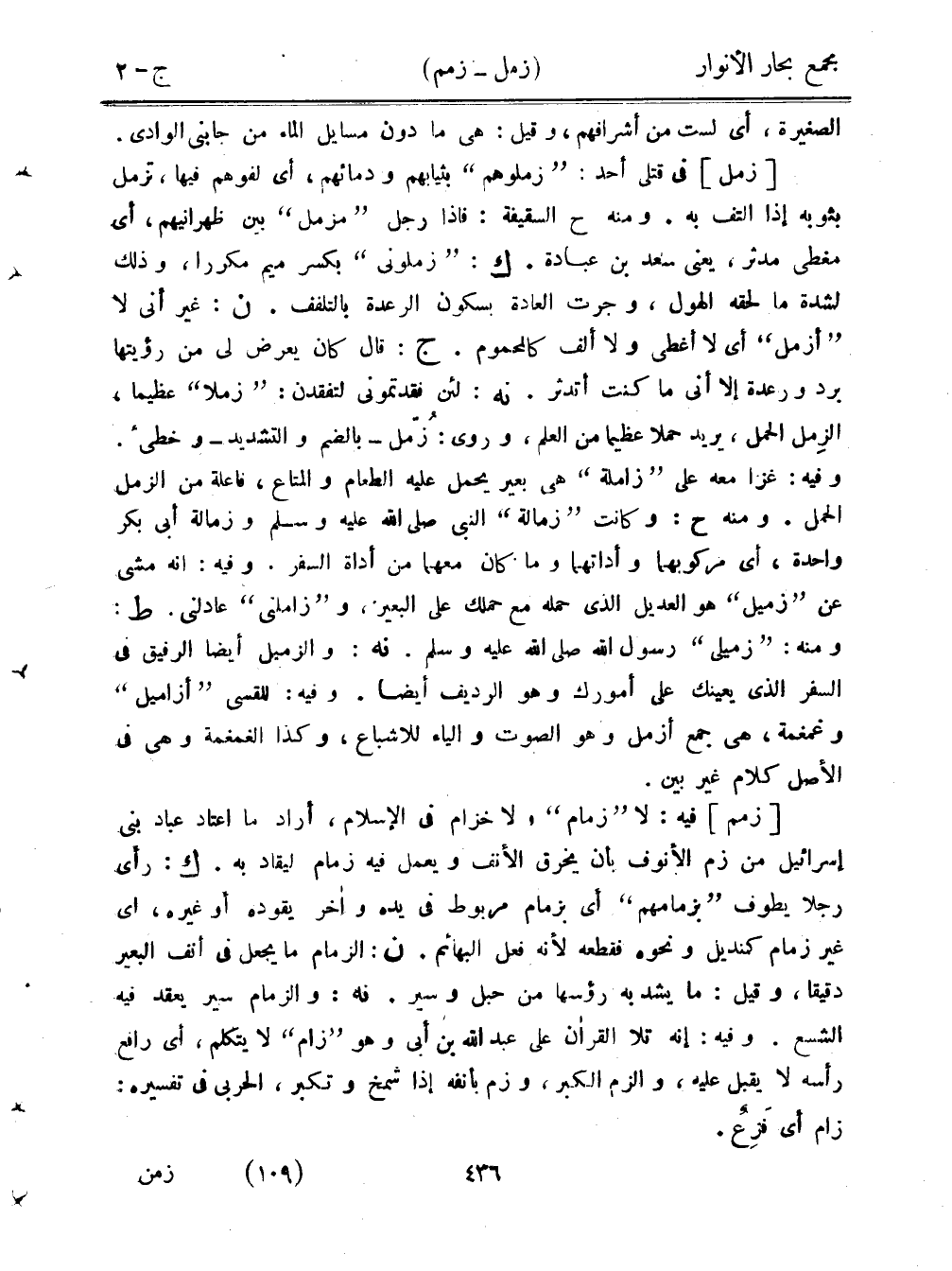 [زمل] في قتلي أحد: "زملوهم" بثيابهم ودمائهم، أي لفوهم فيها، تزمل بثوبه إذا التف به. ومنه ح السقيفة: فإذا رجل "مزمل" بين ظهرانيهم، أي مغطى مدثر، يعني سعد بن عبادة. ك: "زملوني" بكسر ميم مكررا، وذلك لشدة ما لحقه الهول، وجرت العادة بسكون الرعدة بالتفف. ن: غير أني لا "أزمل" أي لا أغطي ولا ألف كالمحموم. ج: قال كان يعرض لي من رؤيتها برد ورعدة إلا أني ما كنت أتدثر. نه: لئن فقدتموني لتفقدن: "زملا" عظيما، الزمل الحمل، يريد حملا عظيمًا من العلم، وروى: زُمل - بالضم والتشديد - وخطيء. وفيه: غزا معه على "زاملة" هي بعير يحمل عليه الطعام والمتاع، فاعلة من الزمل الحمل. ومنه ح: وكانت "زمالة" النبي صلى الله عليه وسلم زمالة أبي بكر واحدة، أي مركوبهما وأدائهما وما كان معهما من أداة السفر. وفيه: أنه مشى عن "زميل" هو العديل الذي حمله مع حملك على البعير، و"زاملني" عادلني. ط: ومنه: "زميلي" رسول الله صلى الله عليه وسلم. نه: والزميل أيضًا الرفيق في السفر الذي يعينك على أمور وهو الرديف أيضًا. وفيه: للقسي "أزاميل" وغمغمة، هي جمع أزمل وهو الصوت والياء للإشباع، وكذا الغمغمة وهي في الأصل كلام غير بين.
