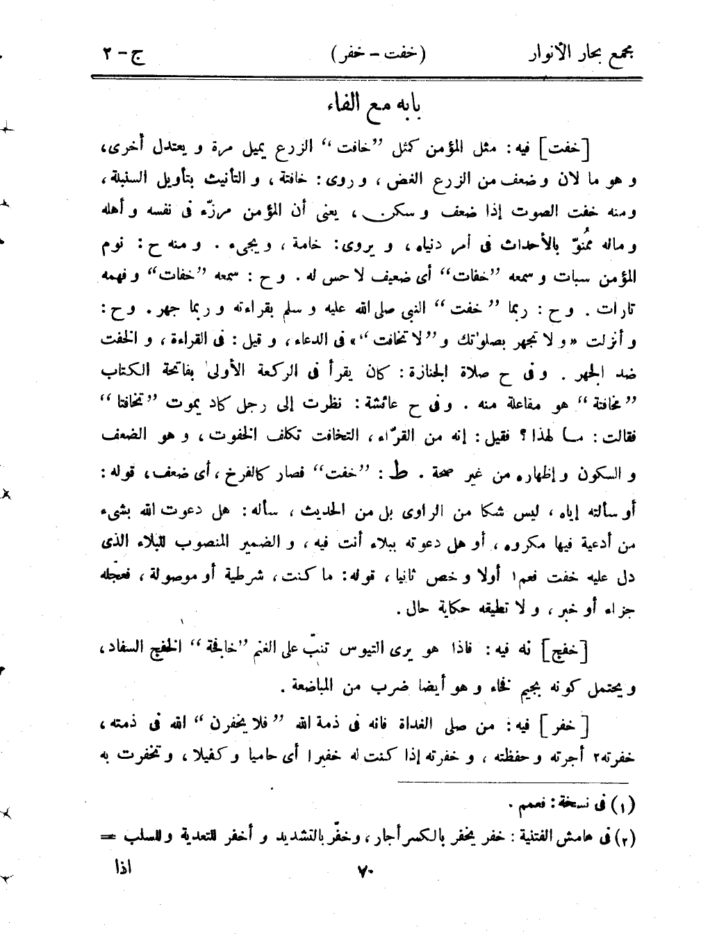 [خفت] فيه: مثل المؤمن كمثل "خافت" الزرع يميل مرة ويعتدل أخرى، وهو ما لان وضعف من الزرع الغض، وروى: خافتة، والتأنيث بتأويل السنبلة، ومنه خفت الصوت إذا ضعف وسكن، يعني أن المؤمن مرزء في نفسه وأهله وماله ممنوّ بالأحداث في أمر دنياه، ويروى: خامة، ويجيء. ومنه ح: نوم المؤمن سبات وسمعه "خفات" أي ضعيف لا حس له. وح: سمعه "خفات" وفهمه تارات. وح: ربما "خفت" النبي صلى الله عليه وسلم بقراءته وربما جهر. وح: وأنزلت "لا تجهر بصلواتك ولا تخافت" في الدعاء، وقيل: في القراءة، والخفت ضد الجهر. وفي ح صلاة الجنازة: كان يقرأ في الركعة الأولى بفاتحة الكتاب "مخافتة" هو مفاعلة منه. وفي ح عائشة: نظرت إلى رجل كاد يموت "تخافتا" فقالت: ما لهذا؟ فقيل: إنه من القراء، التخافت تكلفت الخفوت، وهو الضعف والسكون وإظهاره من غير صحة. ط: "خفت" فصار كالفرخ، أي ضعف، قوله: أو سألته إياه، ليس شكا من الراوي بل من الحديث، سأله: هل دعوت الله بشيء من أدعية فيها مكروه، أو هل دعوته ببلاء أنت فيه، والضمير المنصوب للبلاء الذي دل عليه خفت فعم أولًا وخص ثانيًا، قوله: ما كنت، شرطية أو موصولة، فعجله جزاء أو خبر، ولا تطيقه حكاية حال.