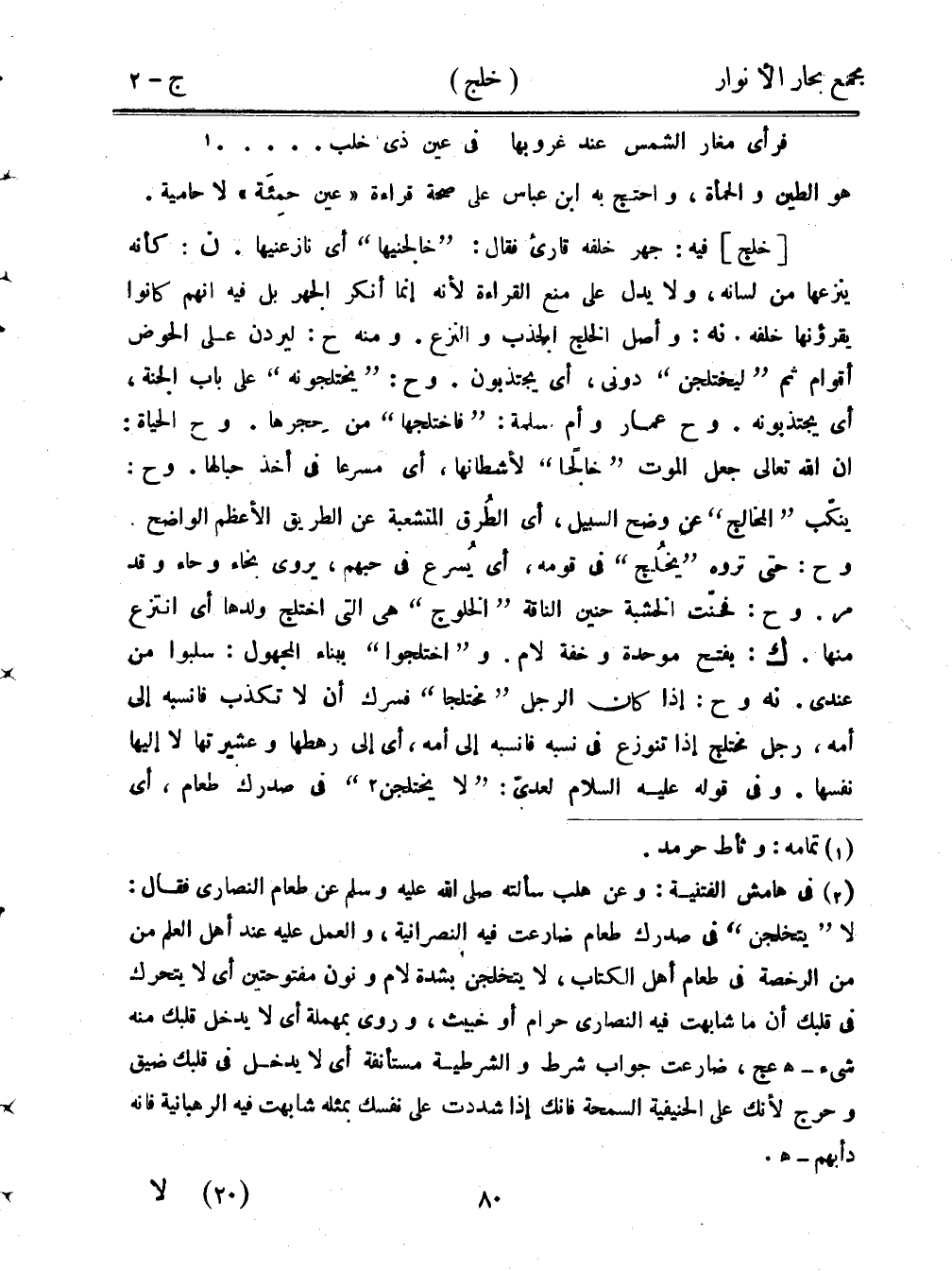 [خلج] فيه: جهر خلفه قارئ فقال: "خالجنيها" أي نازعنيها. ن: كأنه ينزعها من لسانه، ولا يدل على منع القراءة لأنه إنما أنكر الجهر بل فيه أنهم كانوا يقرؤنها خلفه. نه: وأصل الخلج الجذب والنزع. ومنه ح: ليردن على الحوض أقوام ثم "ليختلجن" دوني، أي يجتذبون. وح: "يختلجونه" على باب الجنة، أي يجتذبونه. وح عمار وأم سلمة: "فاختلجها" من حجرها. وح الحياة: أن الله تعالى جعل الموت "خالجا" لأشطانها، أي مسرعًا في أخذ حبالها. وح: ينكب "المخالج" عن وضح السبيل، أي الطرق المتشعبة عن الطريق الأعظم الواضح. وح: حتى تروه "يخلج" في قومه، أي يسرع في حبهم، يروى بخاءوحاء وقد مر وح: فحنت الخشبة حنين الناقة "الخلوج" هي التي اختلج ولدها أي انتزع منها. ك: بفتح موحدة وخفة لام. و"اختلجوا" ببناء المجهول: سلبوا من عندي. نه وح: إذا كان الرجل "مختلجا" فسرك أن لاتكذب فانسبه إلى أمه. رجل مختلج إذا تنوزع في نسبه فانسبه إلى أمه، أي إلى رهطها وعشيرتها لا إليها نفسها. وفي قوله عليه السلام لعدي: "لا يختلجن" في صدرك طعام، أي