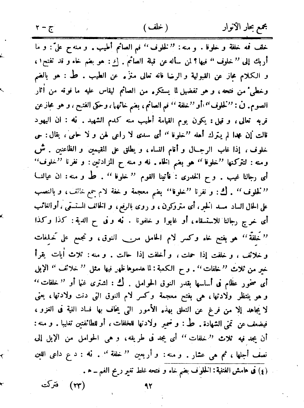 خلف فمه خلفة وخلوفا. ومنه: "لخلوف" فم الصائم أطيب. ومنه ح علىّ: وما أربك إلى "خلوف" فيها؟ لمن سأله عن قبلة الصائم. ك: هو بضم خاء وقد تفتح، والكلام مجاز عن القبولية والرضا فإنه تعالى منزه عن الطيب. ط: هو بالضم وخطيء من فتحه، وهو تفضيل لما يستكره من الصائم ليقاس عليه ما فوقه من أثار الصوم. ن: "لخلوف" أو "خلفة" فم الصائم، بضم خائهما، وحكى الفتح، وهو مجاز عن قربه تعالى، وقيل: يكون يوم القيامة أطيب منه كدم الشهيد. نه: أن اليهود قالت إن محمدًا لم يترك أهله "خلوفًا" أي سدى لا راعي لهن ولا حامي، يقال حي خلوف، إذا غاب الرجال وأقام النساء، ويطلق على المقيمين والظاعنين. ش ومنه: لتتركنها "خلوفًا" هو بضم الخاء. نه ومنه ح المزادتين: ونفرنا "خلوف" أي رجالنا غيب. وح الخدري: فأتينا القوم "خلوفًا". ط ومنه: أن عيالنا "لخلوف". ك: ونفرنا "خلوفا" بضم معجمة وخفة لام جمع خالف، وبالنصب على الحال الساد مسد الخبر، أي متروكون، وروى بالرفع، والخالف المستسقي، أو الغائب أي خرج رجالنا للاستسقاء، أو غابوا وخلفونا. نه وفي ح الدية: كذا وكذا "خلفة" هو بفتح خاء وكسر لام الحامل من النوق، وتجمع على خلفات وخلائف، وخلفت إذا حملت، وأخلفت إذا حالت. ومنه: ثلاث آيات يقرأ خير من ثلاث "خلفات". وح الكعبة: لما هدموها ظهر فيها مثل "خلائف" الإبل أي صخور عظام في أساسها بقدر النوق الحوامل. ك: اشترى غنمًا أو "خلفات" وهو ينتظر ولادتها، هي بفتح معجمة وكسر لام النوق التي دنت ولادتها، يعني لا يجاهد إلا من فرغ عن التعلق بهذه الأمور التي يخاف بها فساد النية في الغزو، فيضعف عن تمني الشهادة. ط: وضمير ولادتها للخلفات، أو للطائفتين تغليبًا. ومنه: أن يجد فيه ثلاث "خلفات" أي يجد في طريقه، وهي الحوامل من الإبل إلى نصف أجلها، ثم هي عشار. ومنه: وأربعين "خلفة". نه: دع داعي اللبن
