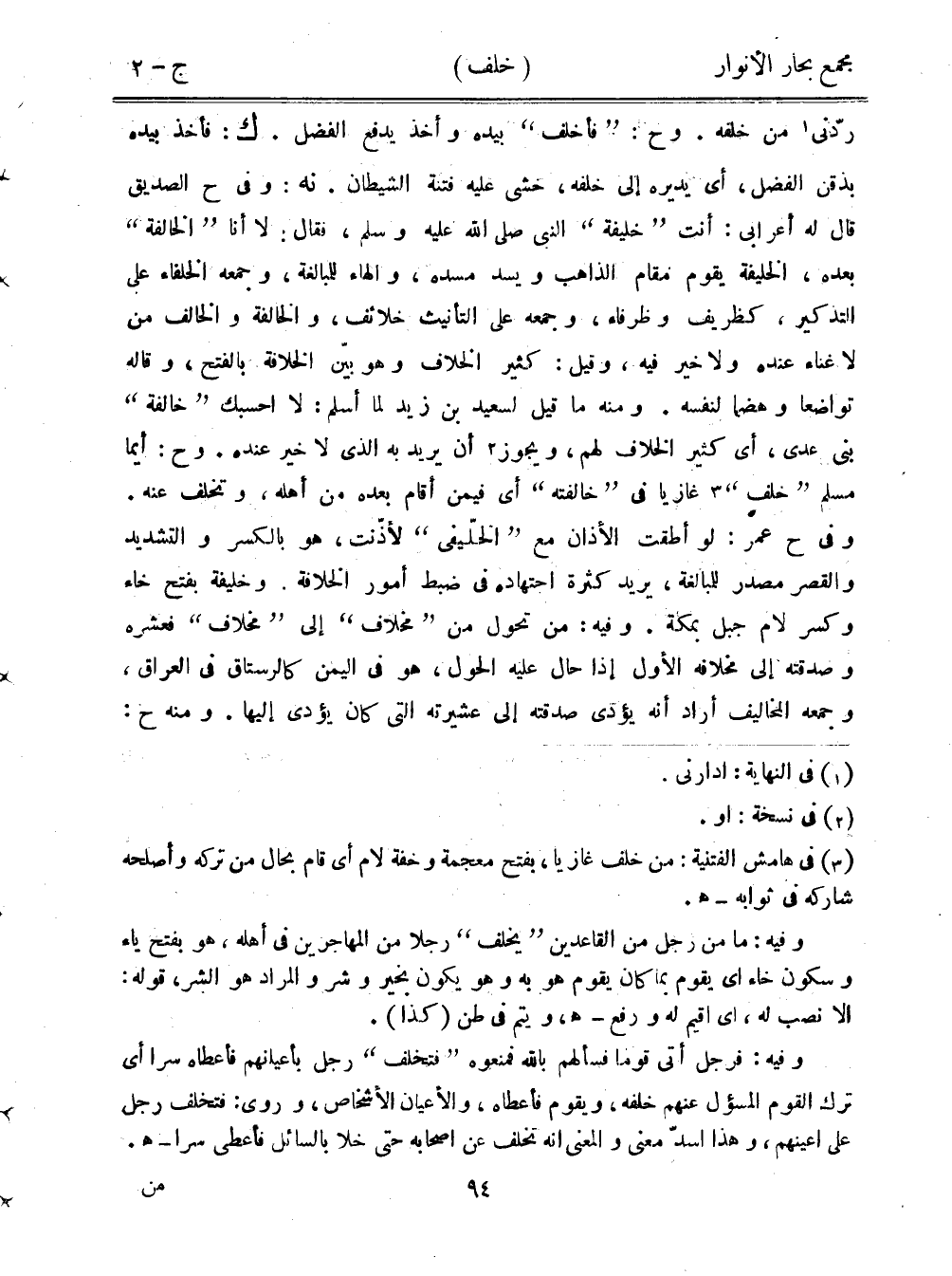 ردني من خلفه. وح: "فأخلف" بيده وأخذ يدفع الفضل. ك: فأخذ بيده بذقن الفضل، أي يديره إلى خلفه، خشي عليه فتنة الشيطان. نه: وفي ح الصديق قال له أعرابي: أنت "خليفة" النبي صلى الله عليه وسلم، فقال: لا أنا "الخالفة" بعده، الخليفة يقوم مقام الذاهب ويسد مسده، والهاء للمبالغة، وجمعه الخلقاء على التذكير، كظريف وظرفاء، وجمعه على التأنيث خلائف، والخالفة والخالف من لا غناء عنده ولا خير فيه، وقيل: كثير الخلاف وهو بين الخلافة بالفتح، وقاله تواضعا وهضما لنفسه. ومنه ما قيل لسعيد بن زيد لما أسلم: لا أحسبك "خالفة" بني عدي، أي كثير الخلاف لهم، ويجوز أن يريد به الذي لا خير عنده. وح: أيما مسلم "خلف" غازيًا في "خالفته" أي فيمن أقام بعده من أهله، وتخلف عنه. وفي ح عمر: لو أطلقت الأذان مع "الخليفي" لأذنت، هو بالكسر والتشديد والقصر مصدر للمبالغة، يريد كثرة اجتهاده في ضبط أمور الخلافة. وخليفة بفتح خاء وكسر لام جبل بمكة. وفيه: من تحول من "مخلاف" إلى "مخلاف" فعشره وصدقته إلى مخلافه الأول إذا حال عليه الحول، هو في اليمن كالرستاق في العراق، وجمعه المخاليف أراد أنه يؤدي صدقته إلى عشيرته التي كان يؤدي إليها. ومنه ح: