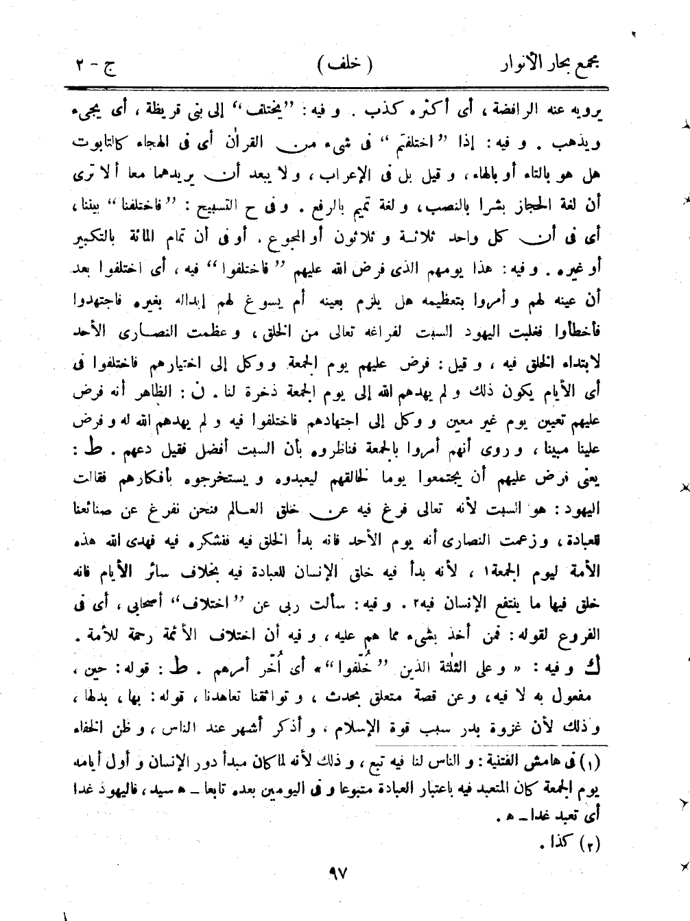 يرويه عنه الرافضة، أي أكثره كذب. وفيه: "يختلف" إلى بني قريظة، أي يجيء ويذهب. وفيه: إذا "اختلفتم" في شيء من القرآن أي في الهجاء كالتابوت هل هو بالتاء أو بالهاء، وقيل بل في الإعراب، ولا يبعد أن يريدهما معًا ألا ترى أن لغة الحجاز بشرًا بالنصب، ولغة تميم بالرفع. وفي ح التسبيح: "فاختلفنا" بيننا، أي في أن كل واحد ثلاثة وثلاثون أو المجموع. أو في أن تمام المائة بالتكبير أو غيره. وفيه: هذا يومهم الذي فرض الله عليهم "فاختلفوا" فيه، أي اختلفوا بعد أن عينه لهم وأمروا بتعظيمه هل يلزم بعينه أم يسوغ لهم إبداله بغيره فاجتهدوا فأخطأوا فغلبت اليهود السبت لفراغه تعالى من الخلق، وعظمت النصارى الأحد لابتداء الخلق فيه، وقيل: فرض عليهم يوم الجمعة ووكل إلى اختيارهم فاختلفوا في أي الأيام يكون ذلك ولم يهدهم الله إلى يوم الجمعة ذخرة لنا. ن: الظاهر أنه فرض عليهم تعيين يوم غير معين ووكل إلى اجتهادهم فاختلفوا فيه ولم يهدهم الله له وفرض علينا مبينا، وروي أنهم أمروا بالجمعة فناظروه بأن السبت أفضل فقيل دعهم. ط: يعني فرض عليهم أن يجتمعوا يومًا لخالقهم ليعبدوه ويستخرجوه بأفكارهم فقالت اليهود: هو السبت لأنه تعالى فرغ فيه عن خلق العالم فنحن نفرغ عن صنائعنا للعبادة، وزعمت النصارى أنه يوم الأحد فإنه بدأ الخلق فيه فنشكره فيه فهدى الله هذه الأمة ليوم الجمعة، لأنه بدأ فيه خلق الإنسان للعبادة فيه بخلاف سائر الأيام فإنه خلق فيها ما ينتفع الإنسان فيه. وفيه: سألت ربي عن "اختلاف" أصحابي، أي في الفروع لقوله: فمن أخذ بشيء مما هم عليه، وفيه أن اختلاف الأئمة رحمة للأمة. ك وفيه: "وعلى الثلاثة الذين "خلفوا" أي أُخر أمرهم. ط: قوله: حين، مفعول به لا فيه، وعن قصة متعلق بحدث، وتواثقنا تعاهدنا، قوله: بها، بدلها، وذلك لأن غزوة بدر سبب قوة الإسلام، وأذكر أشهر عند الناس، وظن الخفاء