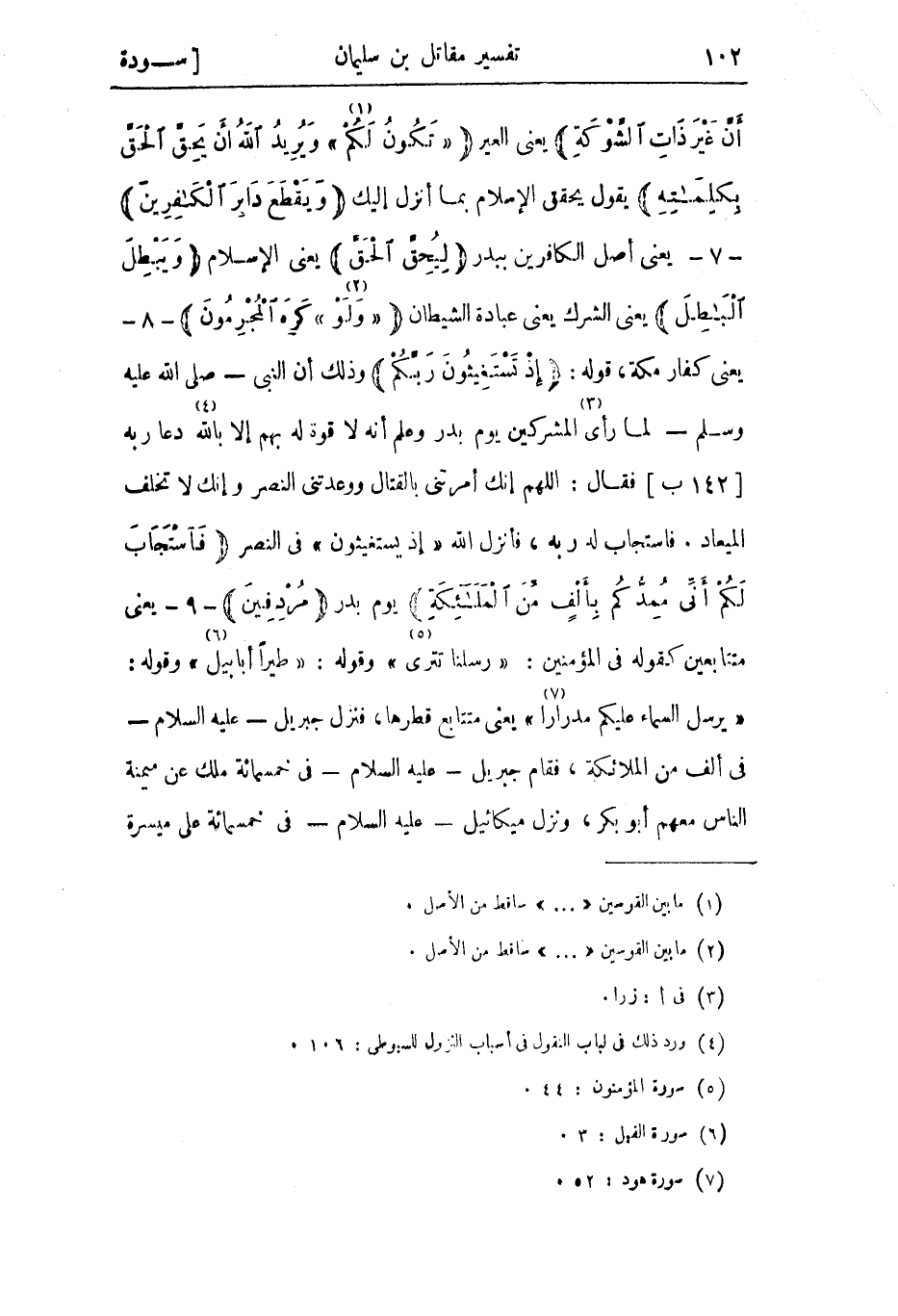 يعني العير «تَكُونُ لَكُمْ «1» » وَيُرِيدُ اللَّهُ أَنْ يُحِقَّ الْحَقَّ بِكَلِماتِهِ يقول يحقق الإسلام بما أنزل إليك وَيَقْطَعَ دابِرَ الْكافِرِينَ- 7- يعني أصل الكافرين ببدر لِيُحِقَّ الْحَقَّ يعني الإسلام وَيُبْطِلَ الْباطِلَ يعني الشرك يعني عبادة الشيطان «وَلَوْ «2» » كَرِهَ الْمُجْرِمُونَ- 8- يعنى كفار مكة، قوله: إِذْ تَسْتَغِيثُونَ رَبَّكُمْ وذلك