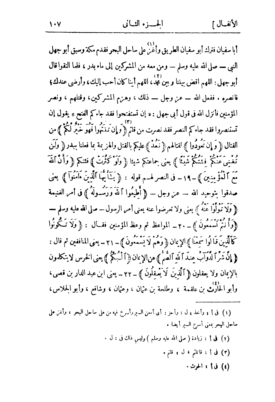 أبا سفيان فترك أبو سفيان الطريق وأغز «1» على ساحل البحر فقدم مكة وسبق أبو جهل النَّبِيُّ- صَلَّى اللَّهُ عَلَيْهِ وَسَلَّمَ- وَمَنْ مَعَهُ من المشركين إلى ماء بدر، فلما التقوا قال أبو جهل: اللهم اقض بيننا وبين محمد «2» ، اللهم أينا كان أحب إليك، وأرضى عندك فانصره. ففعل الله- عز وجل- ذلك، وهزم المشركين، وقتلهم، ونصر المؤمنين فأنزل الله في قول أبي جهل: «إِنْ تَسْتَفْتِحُوا فَقَدْ جاءَكُمُ الْفَتْحُ» يقول إن تستنصروا فقد جاءكم النصر فقد نصرت من قلتم «3» وَإِنْ تَنْتَهُوا فَهُوَ خَيْرٌ لَكُمْ من القتال وَإِنْ تَعُودُوا لقتالهم نَعُدْ عليكم بالقتل والهزيمة بما فعلنا ببدر وَلَنْ تُغْنِيَ عَنْكُمْ فِئَتُكُمْ شَيْئاً يعني جماعتكم شيئا وَلَوْ كَثُرَتْ فئتكم وَأَنَّ اللَّهَ مَعَ الْمُؤْمِنِينَ- 19- فى النصر لهم قوله: يا أَيُّهَا الَّذِينَ آمَنُوا يعني صدقوا بتوحيد الله- عز وجل- أَطِيعُوا اللَّهَ وَرَسُولَهُ فى أمر الغنيمة وَلا تَوَلَّوْا عَنْهُ يعني ولا تعرضوا عنه يعني أمر الرسول- صلى الله عليه وسلم- وَأَنْتُمْ تَسْمَعُونَ- 20- المواعظ ثم وعظ المؤمنين فقال: وَلا تَكُونُوا كَالَّذِينَ قالُوا سَمِعْنا الإيمان وَهُمْ لا يَسْمَعُونَ- 21- يعني المنافقين ثم قال: