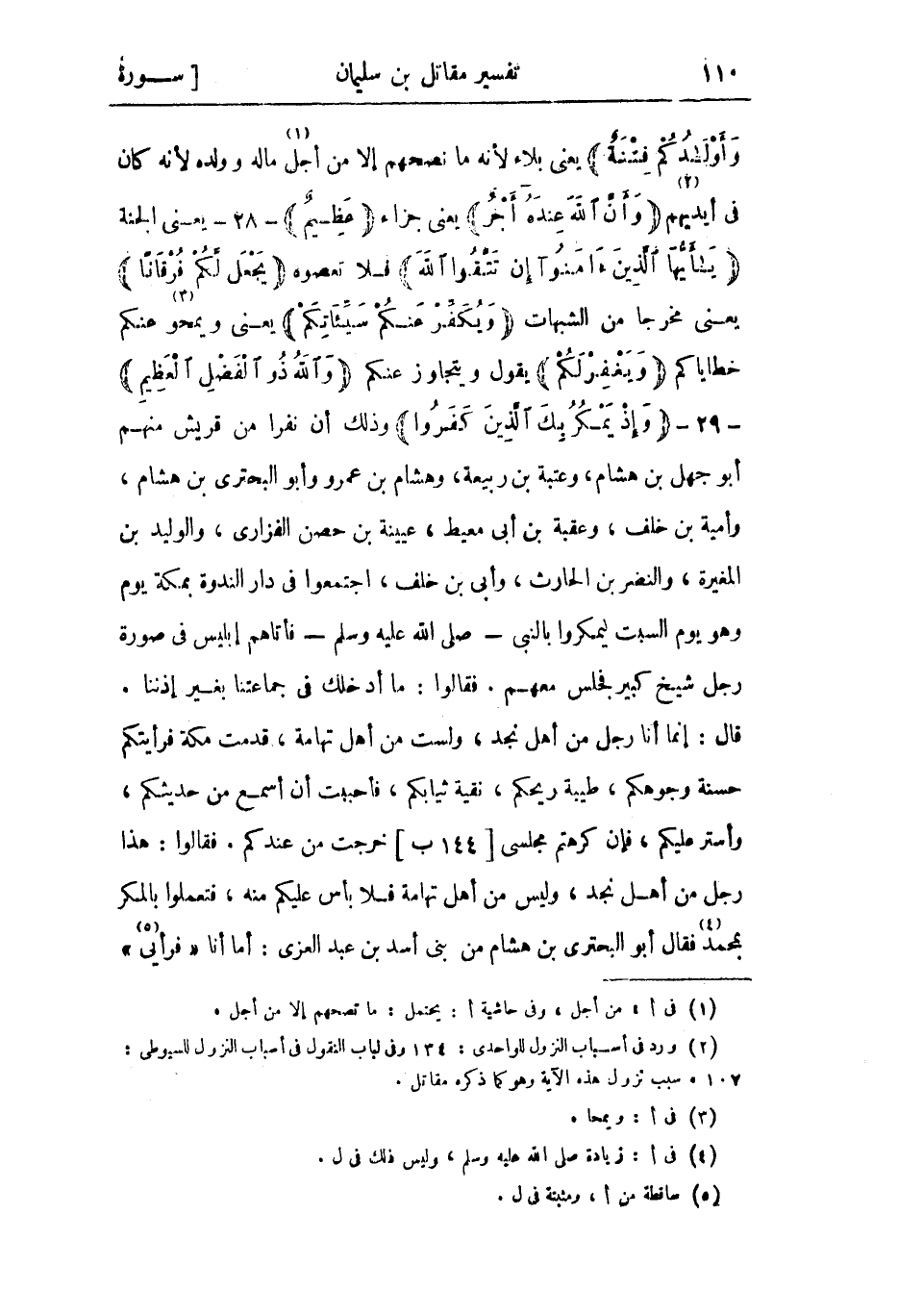 - 28- يعنى الجنة يا أَيُّهَا الَّذِينَ آمَنُوا إِنْ تَتَّقُوا اللَّهَ فلا تعصوه يَجْعَلْ لَكُمْ فُرْقاناً يعني مخرجا من الشبهات وَيُكَفِّرْ عَنْكُمْ سَيِّئاتِكُمْ يعني ويمحو «3» عنكم خطاياكم وَيَغْفِرْ لَكُمْ يقول ويتجاوز عنكم وَاللَّهُ ذُو الْفَضْلِ الْعَظِيمِ- 29- وَإِذْ يَمْكُرُ بِكَ الَّذِينَ كَفَرُوا وذلك أن نفرا من قريش منهم أبو جهل بن هشام، وعتبة بن ربيعة، وهشام بن عمرو وأبو البختري بن هشام، وأمية بن خلف، وعقبة بن أبى معيط، عيينة بن حصن الفزاري، والوليد بن المغيرة، والنضر بن الحارث، وأبي بن خلف، اجتمعوا في دار الندوة بمكة يوم وهو يوم السبت ليمكروا بالنبي- صلى الله عليه وسلم- فأتاهم إبليس في صورة رجل شيخ كبير فجلس معهم. فقالوا: ما أدخلك في جماعتنا بغير إذننا.