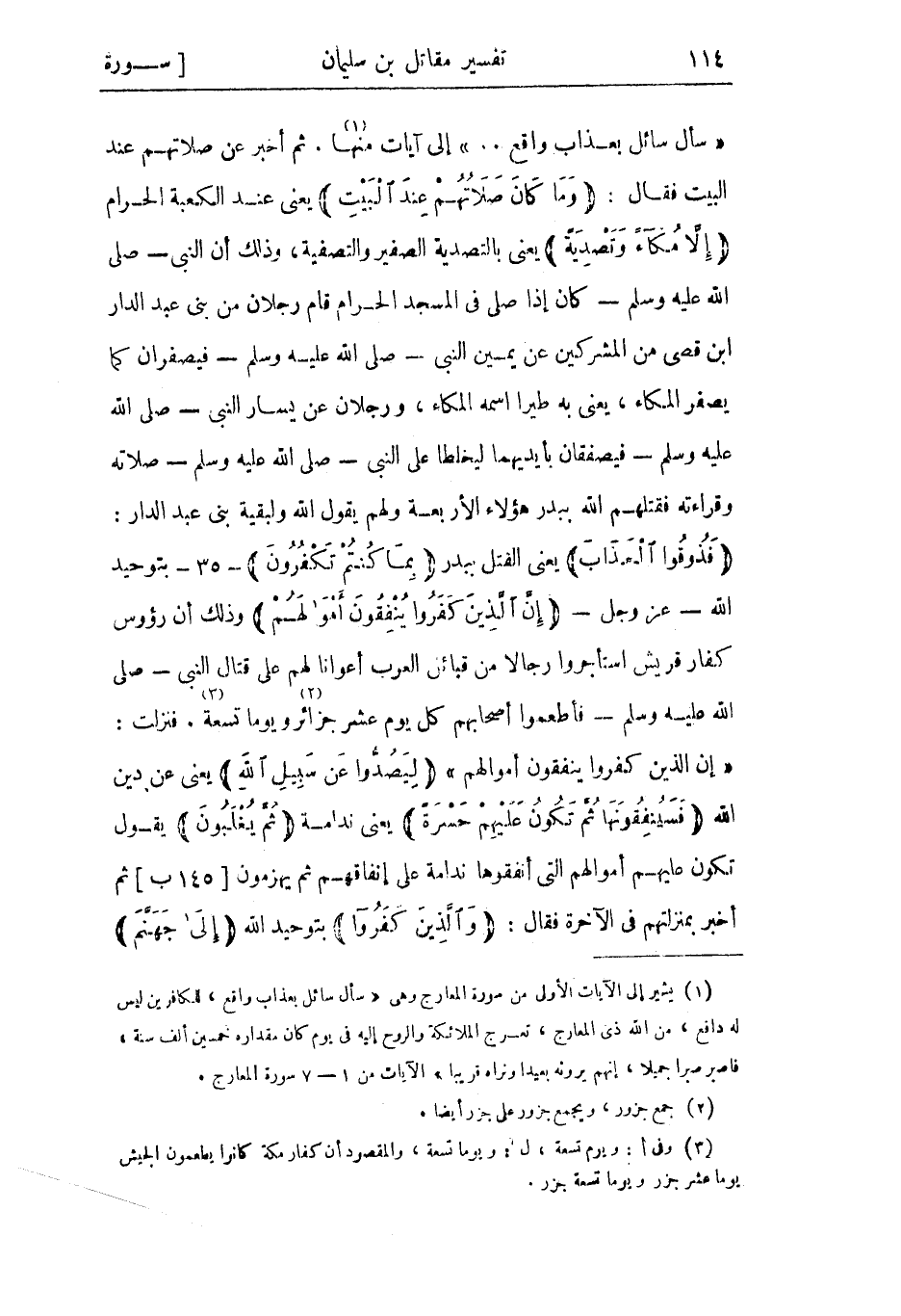 (1) يشير إلى الآيات الأولى من سورة المعارج وهي «سَأَلَ سائِلٌ بِعَذابٍ واقِعٍ، لِلْكافِرينَ لَيْسَ لَهُ دافِعٌ، مِنَ اللَّهِ ذِي الْمَعارِجِ، تَعْرُجُ الْمَلائِكَةُ وَالرُّوحُ إِلَيْهِ فِي يَوْمٍ كانَ مِقْدارُهُ خَمْسِينَ أَلْفَ سَنَةٍ، فَاصْبِرْ صَبْراً جَمِيلًا، إِنَّهُمْ يَرَوْنَهُ بَعِيداً وَنَراهُ قَرِيباً» الآيات من 1- 7 سورة المعارج.