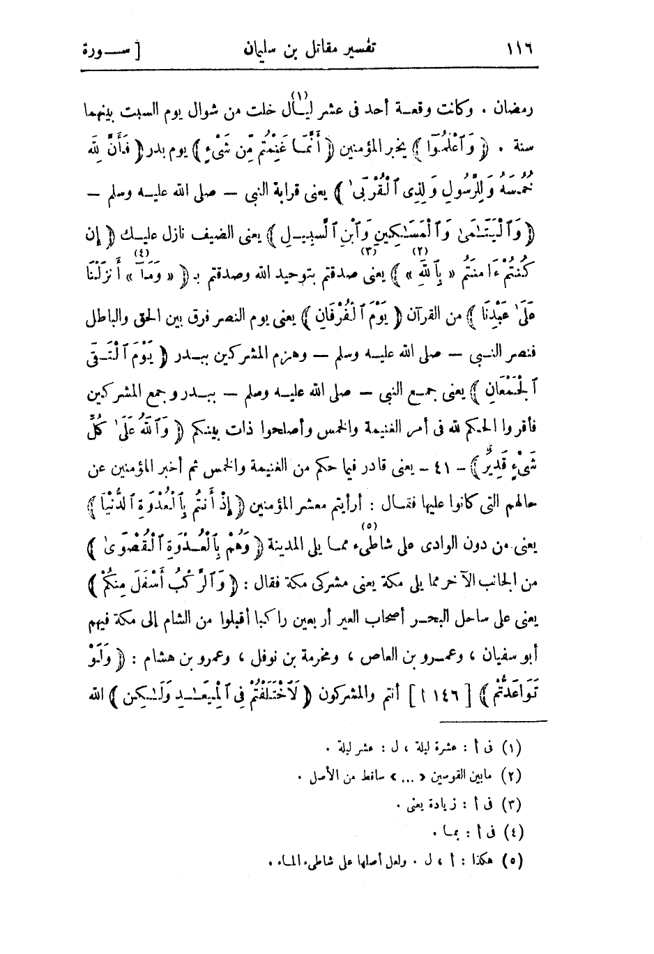 رمضان. وكانت وقعة أحد في عشر ليال «1» خلت من شوال يوم السبت بينهما سنة. وَاعْلَمُوا يخبر المؤمنين أَنَّما غَنِمْتُمْ مِنْ شَيْءٍ يوم بدر فَأَنَّ لِلَّهِ خُمُسَهُ وَلِلرَّسُولِ وَلِذِي الْقُرْبى يعني قرابة النبي- صلى الله عليه وسلم- وَالْيَتامى وَالْمَساكِينِ وَابْنِ السَّبِيلِ يعني الضيف نازل عليك إِنْ كُنْتُمْ آمَنْتُمْ «بِاللَّهِ» «2» يعني «3» صدقتم بتوحيد الله وصدقتم ب «وَما «4» » أَنْزَلْنا عَلى عَبْدِنا من القرآن يَوْمَ الْفُرْقانِ يعني يوم النصر فرق بين الحق والباطل فنصر النبي- صلى الله عليه وسلم- وهزم المشركين ببدر يَوْمَ الْتَقَى الْجَمْعانِ يعني جمع النبي- صلى الله عليه وسلم- ببدر وجمع المشركين فأقروا الحكم لله في أمر الغنيمة والخمس وأصلحوا ذات بينكم وَاللَّهُ عَلى كُلِّ شَيْءٍ قَدِيرٌ- 41- يعني قادر فيما حكم من الغنيمة والخمس ثم أخبر المؤمنين عن حالهم التي كانوا عليها فقال: أرأيتم معشر المؤمنين إِذْ أَنْتُمْ بِالْعُدْوَةِ الدُّنْيا يعني من دون الوادي على شاطئ «5» مما يلي المدينة وَهُمْ بِالْعُدْوَةِ الْقُصْوى من الجانب الآخر مما يلي مكة يعني مشركي مكة فقال: وَالرَّكْبُ أَسْفَلَ مِنْكُمْ يعنى على ساحل البحر أصحاب العير أربعين راكبا أقبلوا من الشام إلى مكة فيهم أبو سفيان، وعمرو بن العاص، ومخرمة بن نوفل، وعمرو بن هشام: وَلَوْ تَواعَدْتُمْ [146 أ] أنتم والمشركون لَاخْتَلَفْتُمْ فِي الْمِيعادِ وَلكِنْ الله