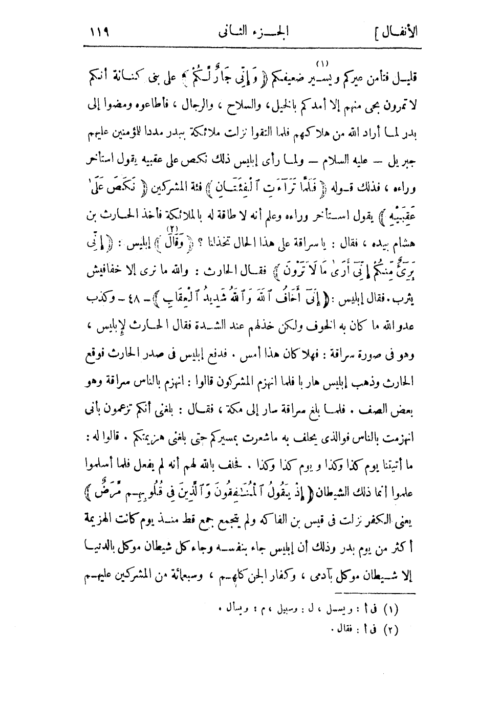 قليل فتأمن عيركم ويسير «1» ضعيفكم وَإِنِّي جارٌ لَكُمْ على بني كنانة أنكم لا تمرون بحي منهم إلا أمدكم بالخيل، والسلاح، والرجال، فأطاعوه ومضوا إلى بدر لما أراد الله من هلاكهم فلما التقوا نزلت ملائكة ببدر مدد للمؤمنين عليهم جبريل- عليه السلام- ولما رأى إبليس ذلك نكص على عقبيه يقول استأخر وراءه، فذلك قوله فَلَمَّا تَراءَتِ الْفِئَتانِ فئة المشركين نَكَصَ عَلى عَقِبَيْهِ يقول استأخر وراءه وعلم أنه لا طاقة له بالملائكة فأخذ الحارث بن هشام بيده، فقال: يا سراقة على هذا الحال تخذلنا؟ وَقالَ «2» إبليس: إِنِّي بَرِيءٌ مِنْكُمْ إِنِّي أَرى ما لا تَرَوْنَ فقال الحارث: والله ما نرى إلا خفافيش يثرب. فقال إبليس: إِنِّي أَخافُ اللَّهَ وَاللَّهُ شَدِيدُ الْعِقابِ- 48- وكذب عدو الله ما كان به الخوف ولكن خذلهم عند الشدة فقال الحارث لإبليس، وهو في صورة سراقة: فهلا كان هذا أمس. فدفع إبليس في صدر الحارث فوقع الحارث وذهب إبليس هاربا فلما انهزم المشركون قالوا: انهزم بالناس سراقة وهو بعض الصف. فلما بلغ سراقة سار إلى مكة، فقال: بلغني أنكم تزعمون بأنى انهزمت بالناس فو الذي يحلف به ما شعرت بمسيركم حتى بلغني هزيمتكم. قالوا له: