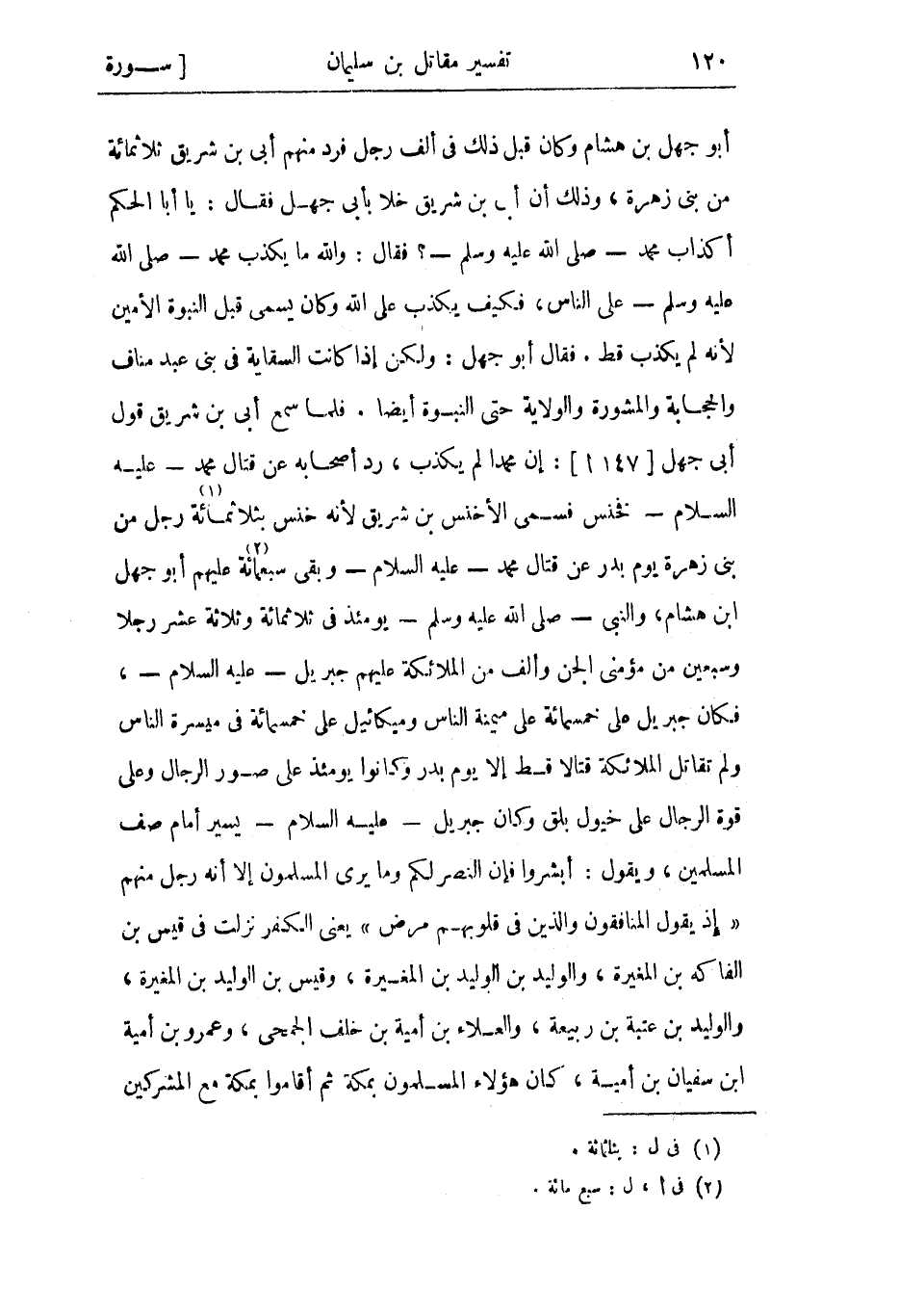 أبو جهل بن هشام وكان قبل ذلك في ألف رجل فرد منهم أبي بن شريق ثلاثمائة من بني زهرة، وذلك أن أبي بن شريق خلا بأبي جهل فقال: يا أبا الحكم أكذاب محمد- صلى الله عليه وسلم-؟ فقال: والله ما يكذب محمد- صلى الله عليه وسلم- على الناس، فكيف يكذب على الله وكان يسمى قبل النبوة الأمين لأنه لم يكذب قط. فقال أبو جهل: ولكن إذا كانت السقاية في بني عبد مناف والحجابة والمشورة والولاية حتى النبوة أيضا. فلما سمع أبي بن شريق قول أبي جهل [147 أ] : إن محمدا لم يكذب، رد أصحابه عن قتال محمد- عليه السلام- فخنس فسمي الأخنس بن شريق لأنه خنس بثلاثمائة «1» رجل من بني زهرة يوم بدر عن قتال محمد- عليه السلام- وبقي سبعمائة «2» عليهم أبو جهل ابن هشام، والنبي- صلى الله عليه وسلم- يومئذ فى ثلاثمائة وثلاثة عشر رجلا وسبعين من مؤمني الجن وألف من الملائكة عليهم جبريل- عليه السلام-، فكان جبريل على خمسمائة على ميمنة الناس وميكائيل على خمسمائة في ميسرة الناس ولم تقاتل الملائكة قتالا قط إلا يوم بدر وكانوا يومئذ على صور الرجال وعلى قوة الرجال على خيول بلق وكان جبريل- عليه السلام- يسير أمام صف المسلمين، ويقول: أبشروا فإن النصر لكم وما يرى المسلمون إلا أنه رجل منهم «إِذْ يَقُولُ الْمُنافِقُونَ وَالَّذِينَ فِي قُلُوبِهِمْ مَرَضٌ» يعني الكفر نزلت في قيس بن الفاكه بن المغيرة، والوليد بن الوليد بن المغيرة، وقيس بن الوليد بن المغيرة، والوليد بن عتبة بن ربيعة، والعلاء بن أمية بن خلف الجمحي، وعمرو بن أمية ابن سفيان بن أمية، كان هؤلاء المسلمون بمكة ثم أقاموا بمكة مع المشركين