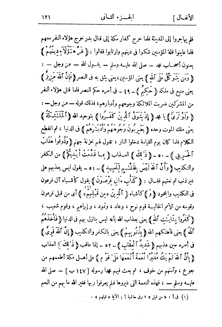 وَلَوْ تَرى يا محمد إِذْ يَتَوَفَّى الَّذِينَ كَفَرُوا بتوحيد الله الْمَلائِكَةُ يعني ملك الموت وحده يَضْرِبُونَ وُجُوهَهُمْ وَأَدْبارَهُمْ في الدنيا، ثم انقطع الكلام فلما كان يوم القيامة دخلوا النار، تقول لهم خزنة جهنم وَذُوقُوا عَذابَ الْحَرِيقِ- 50- ذلِكَ العذاب بِما قَدَّمَتْ أَيْدِيكُمْ من الكفر والتكذيب وَأَنَّ اللَّهَ لَيْسَ بِظَلَّامٍ لِلْعَبِيدِ- 51- يقول ليس يعذبهم على غير ذنب ثم نعتهم فقال: كَدَأْبِ آلِ فِرْعَوْنَ يقول كأشباه آل فرعون في التكذيب والجحود وَكأشباه الَّذِينَ «مِنْ قَبْلِهِمْ» «1» أي من قبل فرعون وقومه من الأمم الخالية قوم نوح، وعاد، وثمود، وإبراهيم، وقوم شعيب، كَفَرُوا بِآياتِ اللَّهِ يعني بعذاب الله بأنه ليس بنازل بهم في الدنيا فَأَخَذَهُمُ اللَّهُ يعني فأهلكهم الله بِذُنُوبِهِمْ يعني بالكفر والتكذيب إِنَّ اللَّهَ قَوِيٌّ في أمره حين عذبهم شَدِيدُ الْعِقابِ- 52- إذا عاقب ذلِكَ العذاب بِأَنَّ اللَّهَ لَمْ يَكُ مُغَيِّراً نِعْمَةً أَنْعَمَها عَلى قَوْمٍ على أهل مكة أطعمهم من جوع، وآمنهم من خوف، ثم بعث فيهم محمدا رسوله [147 ب]- صلى الله عليه وسلم-، فهذه النعمة التي غيروها فلم يعرفوا ربها فغير الله ما بهم من النعم