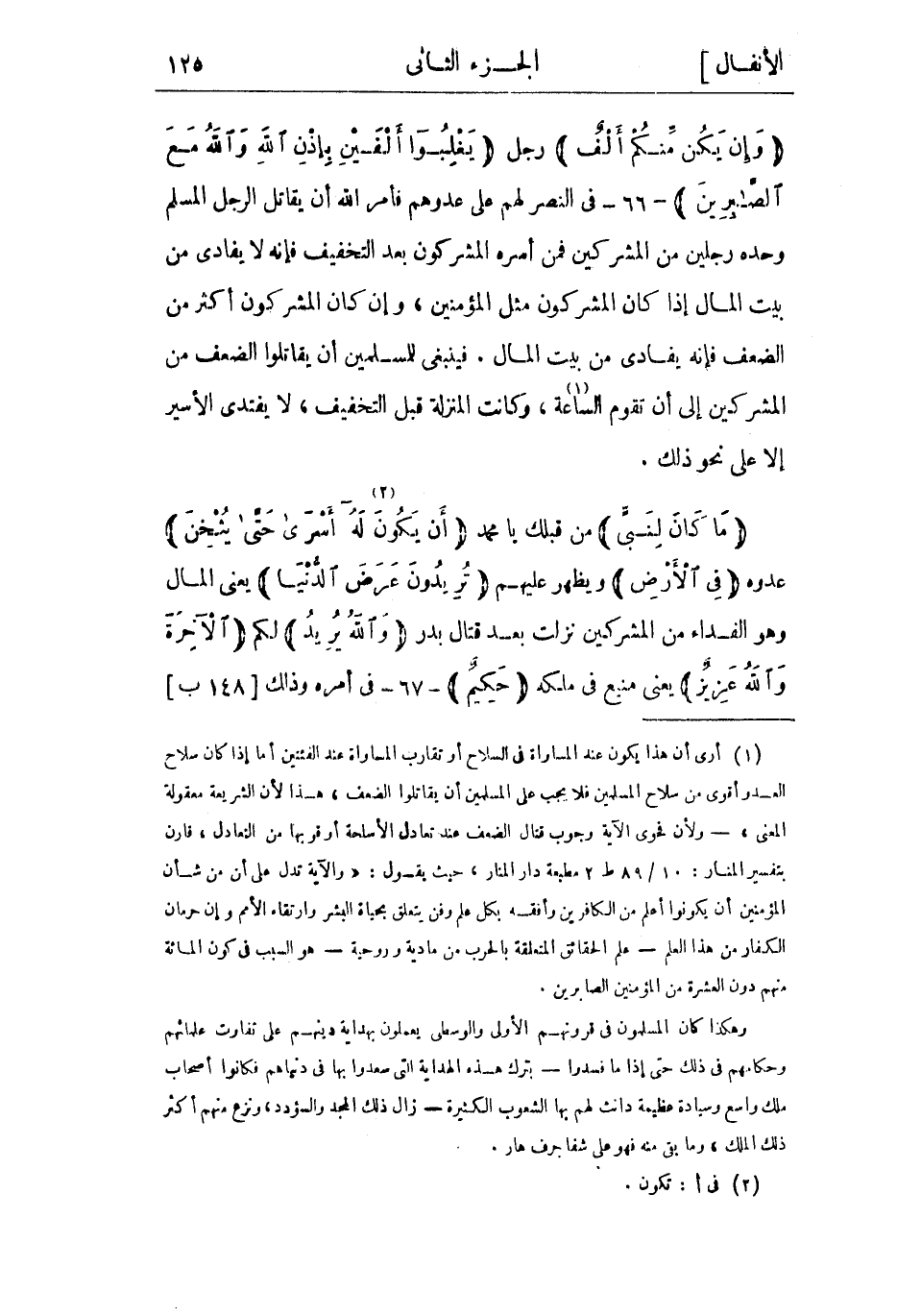 (1) أرى أن هذا يكون عند المساواة فى السلاح أو تقارب المساواة عند الفئتين أما إذا كان سلاح العدو أقوى من سلاح المسلمين فلا يجب على المسلمين أن يقاتلوا الضعف، هذا لأن الشريعة معقولة المعنى، - ولأن فحوى الآية وجوب قتال الضعف عند تعادل الأسلحة أو قربها من التعادل، قارن بتفسير المنار: 10/ 89 ط 2 مطبعة دار المنار، حيث يقول: «والآية تدل على أن من شأن المؤمنين أن يكونوا أعلم من الكافرين وأفقه بكل علم وفن يتعلق بحياة البشر وارتقاء الأمم وإن حرمان الكفار من هذا العلم- علم الحقائق المتعلقة بالحرب من مادية وروحية- هو السبب فى كون المائة منهم دون العشرة من المؤمنين الصابرين.