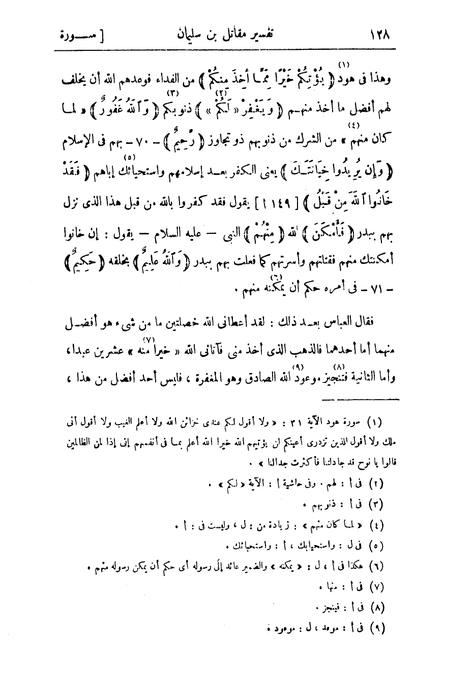 وهذا في هود «1» يُؤْتِكُمْ خَيْراً مِمَّا أُخِذَ مِنْكُمْ من الفداء فوعدهم الله أن يخلف لهم أفضل ما أخذ منهم وَيَغْفِرْ «لَكُمْ» «2» ذنوبكم «3» وَاللَّهُ غَفُورٌ «لما كان منهم «4» » من الشرك من ذنوبهم ذو تجاوز رَحِيمٌ- 70- بهم في الإسلام وَإِنْ يُرِيدُوا خِيانَتَكَ يعني الكفر بعد إسلامهم واستحيائك «5» إياهم فَقَدْ خانُوا اللَّهَ مِنْ قَبْلُ [149 أ] يقول فقد كفروا بالله من قبل هذا الذي نزل بهم ببدر فَأَمْكَنَ الله مِنْهُمْ النبي- عليه السلام- يقول: إن خانوا أمكنتك منهم فقتلتهم وأسرتهم كما فعلت بهم ببدر وَاللَّهُ عَلِيمٌ بخلقه حَكِيمٌ- 71- في أمره حكم أن يمكنه «6» منهم.