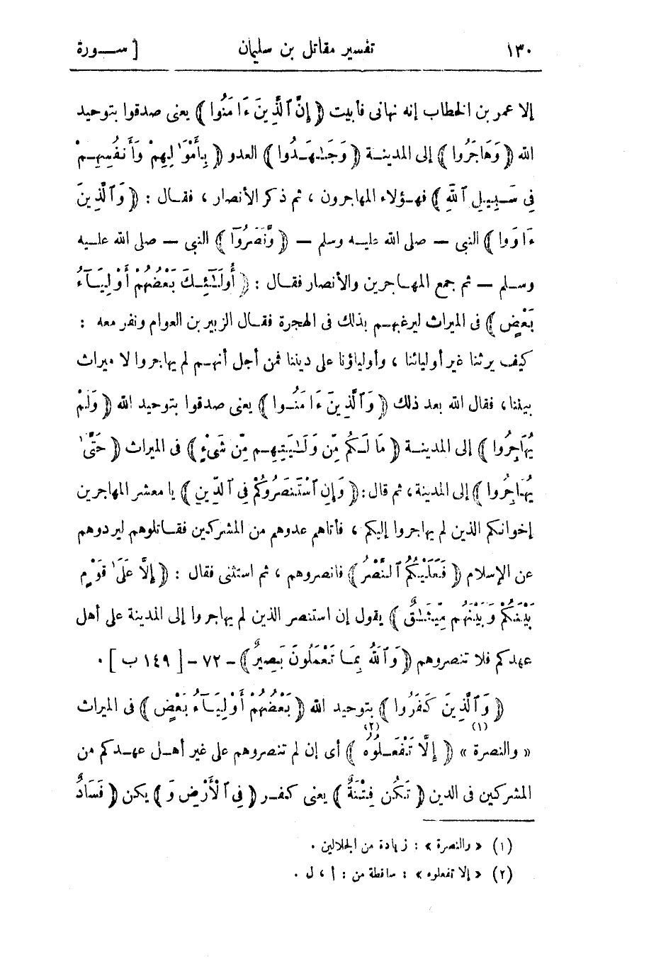 كيف يرثنا غير أوليائنا، وأولياؤنا على ديننا فمن أجل أنهم لم يهاجروا لا ميراث بيننا، فقال الله بعد ذلك وَالَّذِينَ آمَنُوا يعني صدقوا بتوحيد الله وَلَمْ يُهاجِرُوا إلى المدينة مَا لَكُمْ مِنْ وَلايَتِهِمْ مِنْ شَيْءٍ في الميراث حَتَّى يُهاجِرُوا إلى المدينة، ثم قال: وَإِنِ اسْتَنْصَرُوكُمْ فِي الدِّينِ يا معشر المهاجرين إخوانكم الذين لم يهاجروا إليكم، فأتاهم عدوهم من المشركين فقاتلوهم ليردوهم عن الإسلام فَعَلَيْكُمُ النَّصْرُ فانصروهم، ثم استثنى فقال: إِلَّا عَلى قَوْمٍ بَيْنَكُمْ وَبَيْنَهُمْ مِيثاقٌ يقول إن استنصر الذين لم يهاجروا إلى المدينة على أهل عهدكم فلا تنصروهم وَاللَّهُ بِما تَعْمَلُونَ بَصِيرٌ- 72-[149 ب] .