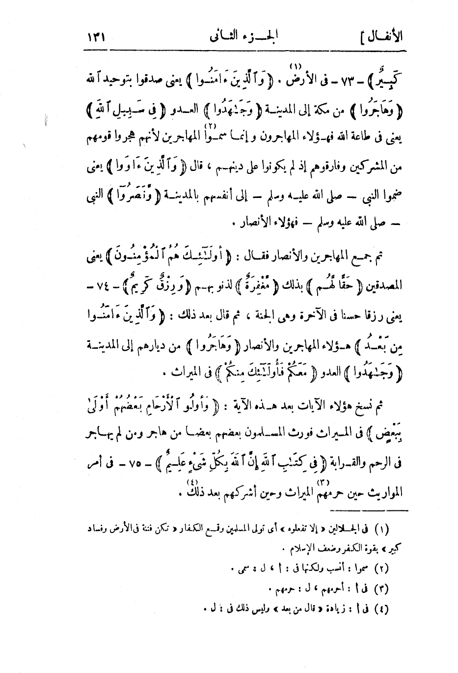 فَسادٌ كَبِيرٌ- 73- في الأرض «1» . وَالَّذِينَ آمَنُوا يعني صدقوا بتوحيد الله وَهاجَرُوا من مكة إلى المدينة وَجاهَدُوا العدو فِي سَبِيلِ اللَّهِ يعني في طاعة الله فهؤلاء المهاجرون وإنما سموا «2» المهاجرين لأنهم هجروا قومهم من المشركين وفارقوهم إذ لم يكونوا على دينهم، قال وَالَّذِينَ آوَوْا يعني ضموا النبي- صلى الله عليه وسلم- إلى أنفسهم بالمدينة وَنَصَرُوا النبي- صلى الله عليه وسلم- فهؤلاء الأنصار.