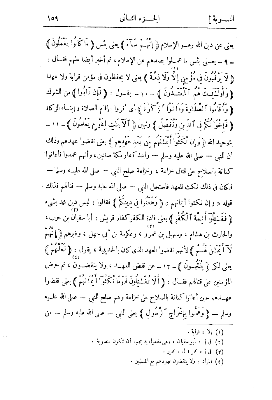 لا يَرْقُبُونَ فِي مُؤْمِنٍ إِلًّا «1» وَلا ذِمَّةً يعني لا يحفظون في مؤمن قرابة ولا عهدا وَأُولئِكَ هُمُ الْمُعْتَدُونَ- 10- يقول: فَإِنْ تابُوا من الشرك وَأَقامُوا الصَّلاةَ وَآتَوُا الزَّكاةَ أي أقروا بإقام الصلاة وإيتاء الزكاة فَإِخْوانُكُمْ فِي الدِّينِ وَنُفَصِّلُ ونبين الْآياتِ لِقَوْمٍ يَعْلَمُونَ- 11- بتوحيد الله وَإِنْ نَكَثُوا أَيْمانَهُمْ مِنْ بَعْدِ عَهْدِهِمْ يعني نقضوا عهدهم وذلك أن النبي- صلى الله عليه وسلم- واعد كفار مكة سنتين، وأنهم عمدوا فأعانوا كنانة بالسلاح على قتال خزاعة، وخزاعة صلح النبي- صلى الله عليه وسلم- فكان في ذلك نكث للعهد فاستحل النبي- صلى الله عليه وسلم- قتالهم فذلك قوله «وَإِنْ نَكَثُوا أَيْمانَهُمْ» وَطَعَنُوا فِي دِينِكُمْ فقالوا: ليس دين محمد بشيء فَقاتِلُوا أَئِمَّةَ الْكُفْرِ يعني قادة الكفر كفار قريش: أبا سفيان «2» بن حرب، والحارث بن هشام، وسهيل بن عمرو «3» ، وعكرمة بن أبي جهل، وغيرهم إِنَّهُمْ لا أَيْمانَ لَهُمْ لأنهم نقضوا العهد الذي كان بالحديبية، يقول: لَعَلَّهُمْ يعني لكي يَنْتَهُونَ- 12- عن نقض العهد، ولا ينقضون «4» ، ثم حرض المؤمنين على قتالهم فقال: أَلا تُقاتِلُونَ قَوْماً نَكَثُوا أَيْمانَهُمْ يعني نقضوا عهدهم حين أعانوا كنانة بالسلاح على خزاعة وهم صلح النبي- صلى الله عليه وسلّم- وَهَمُّوا بِإِخْراجِ الرَّسُولِ يعني النبي- صلى الله عليه وسلم- مِنْ