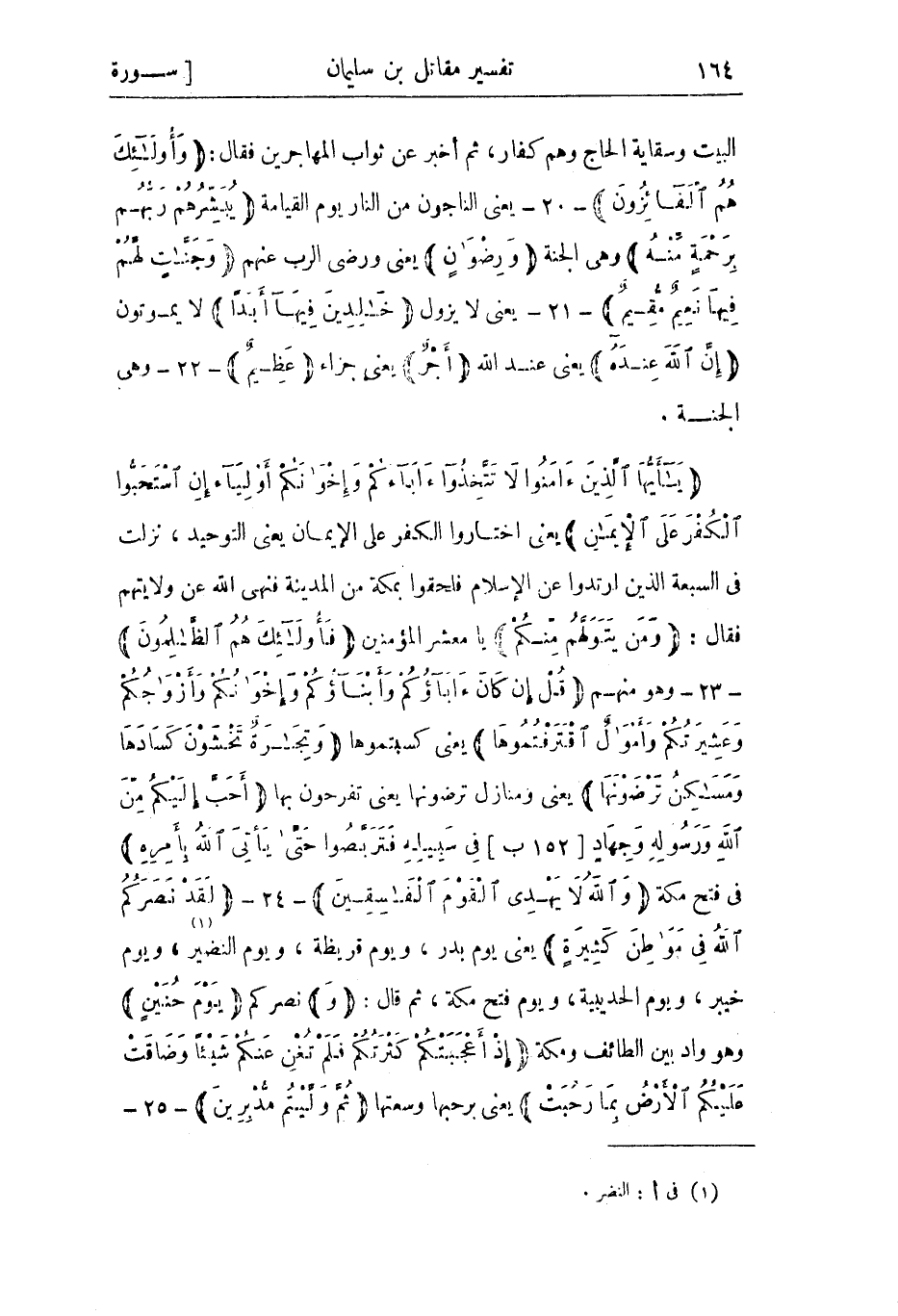 يا أَيُّهَا الَّذِينَ آمَنُوا لا تَتَّخِذُوا آباءَكُمْ وَإِخْوانَكُمْ أَوْلِياءَ إِنِ اسْتَحَبُّوا الْكُفْرَ عَلَى الْإِيمانِ يعني اختاروا الكفر على الإيمان يعني التوحيد، نزلت في السبعة الذين ارتدوا عن الإسلام فلحقوا بمكة من المدينة فنهى الله عن ولايتهم فقال: وَمَنْ يَتَوَلَّهُمْ مِنْكُمْ يا معشر المؤمنين فَأُولئِكَ هُمُ الظَّالِمُونَ- 23- وهو منهم قُلْ إِنْ كانَ آباؤُكُمْ وَأَبْناؤُكُمْ وَإِخْوانُكُمْ وَأَزْواجُكُمْ وَعَشِيرَتُكُمْ وَأَمْوالٌ اقْتَرَفْتُمُوها يعني كسبتموها وَتِجارَةٌ تَخْشَوْنَ كَسادَها وَمَساكِنُ تَرْضَوْنَها يعني ومنازل ترضونها يعني تفرحون بها أَحَبَّ إِلَيْكُمْ مِنَ اللَّهِ وَرَسُولِهِ وَجِهادٍ فِي سَبِيلِهِ فَتَرَبَّصُوا حَتَّى يَأْتِيَ اللَّهُ بِأَمْرِهِ [152 ب] في فتح مكة وَاللَّهُ لا يَهْدِي الْقَوْمَ الْفاسِقِينَ- 24- لَقَدْ نَصَرَكُمُ اللَّهُ فِي مَواطِنَ كَثِيرَةٍ يعني يوم بدر، ويوم قريظة، ويوم النضير «1» ، ويوم خيبر، ويوم الحديبية، ويوم فتح مكة، ثم قال: وَنصركم يَوْمَ حُنَيْنٍ وهو واد بين الطائف ومكة إِذْ أَعْجَبَتْكُمْ كَثْرَتُكُمْ فَلَمْ تُغْنِ عَنْكُمْ شَيْئاً وَضاقَتْ عَلَيْكُمُ الْأَرْضُ بِما رَحُبَتْ يعنى برحبها وسعتها ثُمَّ وَلَّيْتُمْ مُدْبِرِينَ- 25-