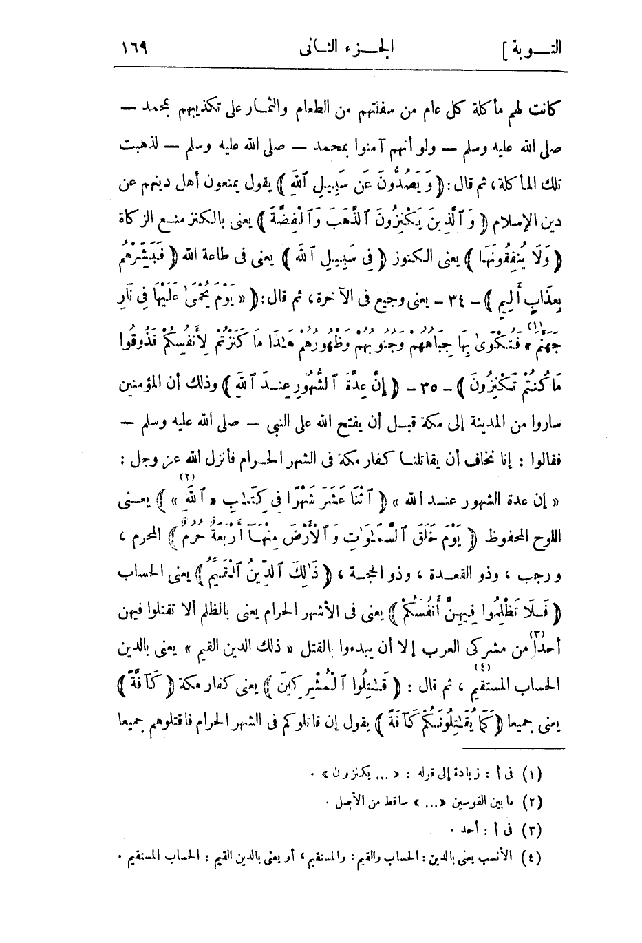 كانت لهم مأكلة كل عام من سفلتهم من الطعام والثمار على تكذيبهم بمحمد- صلى الله عليه وسلم- ولو أنهم آمنوا بمحمد- صلى الله عليه وسلم- لذهبت تلك المأكلة، ثم قال: وَيَصُدُّونَ عَنْ سَبِيلِ اللَّهِ يقول يمنعون أهل دينهم عن دين الإسلام وَالَّذِينَ يَكْنِزُونَ الذَّهَبَ وَالْفِضَّةَ يعني بالكنز منع الزكاة وَلا يُنْفِقُونَها يعني الكنوز فِي سَبِيلِ اللَّهِ يعني في طاعة الله فَبَشِّرْهُمْ بِعَذابٍ أَلِيمٍ- 34- يعني وجيع في الآخرة، ثم قال: «يَوْمَ يُحْمى عَلَيْها فِي نارِ جَهَنَّمَ «1» » فَتُكْوى بِها جِباهُهُمْ وَجُنُوبُهُمْ وَظُهُورُهُمْ هَذَا مَا كَنَزْتُمْ لِأَنْفُسِكُمْ فَذُوقُوا ما كُنْتُمْ تَكْنِزُونَ- 35- إِنَّ عِدَّةَ الشُّهُورِ عِنْدَ اللَّهِ وذلك أن المؤمنين ساروا من المدينة إلى مكة قبل أن يفتح الله على النبي- صلى الله عليه وسلم- فقالوا: إنا نخاف أن يقاتلنا كفار مكة في الشهر الحرام فأنزل الله عز وجل: