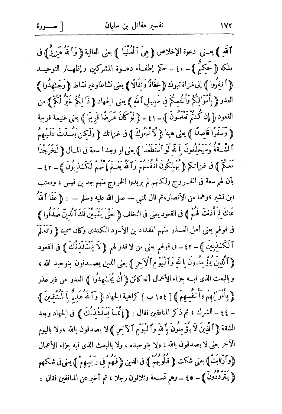 يعني دعوة الإخلاص هِيَ الْعُلْيا يعني العالية وَاللَّهُ عَزِيزٌ في ملكه حَكِيمٌ- 40- حكم إطفاء دعوة المشركين وإظهار التوحيد انْفِرُوا إلى غزاة تبوك خِفافاً وَثِقالًا يعني نشاطا وغير نشاط وَجاهِدُوا العدو بِأَمْوالِكُمْ وَأَنْفُسِكُمْ فِي سَبِيلِ اللَّهِ يعنى الجهاد ذلِكُمْ خَيْرٌ لَكُمْ من القعود إِنْ كُنْتُمْ تَعْلَمُونَ- 41- لَوْ كانَ عَرَضاً قَرِيباً يعني غنيمة قريبة وَسَفَراً قاصِداً يعني هينا لَاتَّبَعُوكَ في غزاتك وَلكِنْ بَعُدَتْ عَلَيْهِمُ الشُّقَّةُ وَسَيَحْلِفُونَ بِاللَّهِ لَوِ اسْتَطَعْنا يعني لو وجدنا سعة في المال لَخَرَجْنا مَعَكُمْ في غزاتكم يُهْلِكُونَ أَنْفُسَهُمْ وَاللَّهُ يَعْلَمُ إِنَّهُمْ لَكاذِبُونَ- 42- بأن لهم سعة في الخروج ولكنهم لم يريدوا الخروج منهم جد بن قيس، ومعتب ابن قشير، وهما من الأنصار، ثم قال للنبي- صلى الله عليه وسلم-: عَفَا اللَّهُ عَنْكَ لِمَ أَذِنْتَ لَهُمْ في القعود يعني في التخلف حَتَّى يَتَبَيَّنَ لَكَ الَّذِينَ صَدَقُوا في قولهم يعني أهل العذر منهم المقداد بن الأسود الكندي وكان سمينا وَتَعْلَمَ الْكاذِبِينَ- 43- في قولهم يعني من لا قدر لهم لا يَسْتَأْذِنُكَ في القعود الَّذِينَ يُؤْمِنُونَ بِاللَّهِ وَالْيَوْمِ الْآخِرِ يعني الذين يصدقون بتوحيد الله، وبالبعث الذي فيه جزاء الأعمال أنه كائن أَنْ يُجاهِدُوا العدو من غير عذر بِأَمْوالِهِمْ وَأَنْفُسِهِمْ [154 ب] كراهية الجهاد وَاللَّهُ عَلِيمٌ بِالْمُتَّقِينَ- 44- الشرك، ثم ذكر المنافقين فقال: إِنَّما يَسْتَأْذِنُكَ في الجهاد وبعد الشقة الَّذِينَ لا يُؤْمِنُونَ بِاللَّهِ وَالْيَوْمِ الْآخِرِ لا يصدقون بالله، ولا باليوم الآخر يعني لا يصدقون بالله، ولا بتوحيده، ولا بالبعث الذي فيه جزاء الأعمال وَارْتابَتْ يعني شكت قُلُوبُهُمْ فى الدين فَهُمْ فِي رَيْبِهِمْ يعني في شكهم يَتَرَدَّدُونَ- 45- وهم تسعة وثلاثون رجلا، ثم أخبر عن المنافقين فقال: