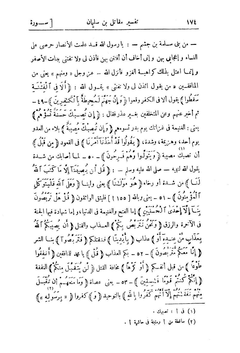 - من بني سلمة بن جشم-: يا رسول الله قد علمت الأنصار حرصي على النساء وإعجابي بهن وإني أخاف أن أفتتن بهن فأذن لي ولا تفتني ببنات الأصفر وإنما اعتلَّ بذلك كراهية الغزو فأنزل الله- عز وجل «وَمِنْهُمْ» يعني من المنافقين «مَنْ يَقُولُ ائْذَنْ لِي وَلا تَفْتِنِّي» يقول الله: أَلا فِي الْفِتْنَةِ سَقَطُوا يقول ألا في الكفر وقعوا وَإِنَّ جَهَنَّمَ لَمُحِيطَةٌ بِالْكافِرِينَ- 49- ثم أخبر عنهم وعن المتخلفين بغير عذر فقال: إِنْ تُصِبْكَ حَسَنَةٌ تَسُؤْهُمْ يعني: الغنيمة في غزاتك يوم بدر تسوءهم وَإِنْ تُصِبْكَ مُصِيبَةٌ بلاء من العدو يوم أحد، وهزيمة، وشدة، يَقُولُوا قَدْ أَخَذْنا أَمْرَنا في القعود مِنْ قَبْلُ أن تصبك «1» مصيبة وَيَتَوَلَّوْا وَهُمْ فَرِحُونَ- 50- لما أصابك من شدة يقول الله لنبيه- صلى الله عليه وسلم-: قُلْ لَنْ يُصِيبَنا إِلَّا مَا كَتَبَ اللَّهُ لَنا من شدة أو رخاء هُوَ مَوْلانا يعني ولينا وَعَلَى اللَّهِ فَلْيَتَوَكَّلِ الْمُؤْمِنُونَ- 51- يعنى وبالله [155 أ] فليثق الواثقون قُلْ هَلْ تَرَبَّصُونَ بِنا إِلَّا إِحْدَى الْحُسْنَيَيْنِ إما الفتح والغنيمة في الدنيا، وإما شهادة فيها الجنة في الآخرة والرزق وَنَحْنُ نَتَرَبَّصُ بِكُمْ العذاب والقتل أَنْ يُصِيبَكُمُ اللَّهُ بِعَذابٍ مِنْ عِنْدِهِ أَوْ عذاب بِأَيْدِينا فنقتلكم فَتَرَبَّصُوا بنا الشر إِنَّا مَعَكُمْ مُتَرَبِّصُونَ- 52- بكم العذاب قُلْ يا محمد للمنافقين أَنْفِقُوا طَوْعاً من قبل أنفسكم أَوْ كَرْهاً مخافة القتل لَنْ يُتَقَبَّلَ مِنْكُمْ النفقة إِنَّكُمْ كُنْتُمْ قَوْماً فاسِقِينَ- 53- يعني عصاة وَما مَنَعَهُمْ أَنْ تُقْبَلَ مِنْهُمْ نَفَقاتُهُمْ إِلَّا أَنَّهُمْ كَفَرُوا بِاللَّهِ بالتوحيد وَكفروا «بِرَسُولِهِ» «2»