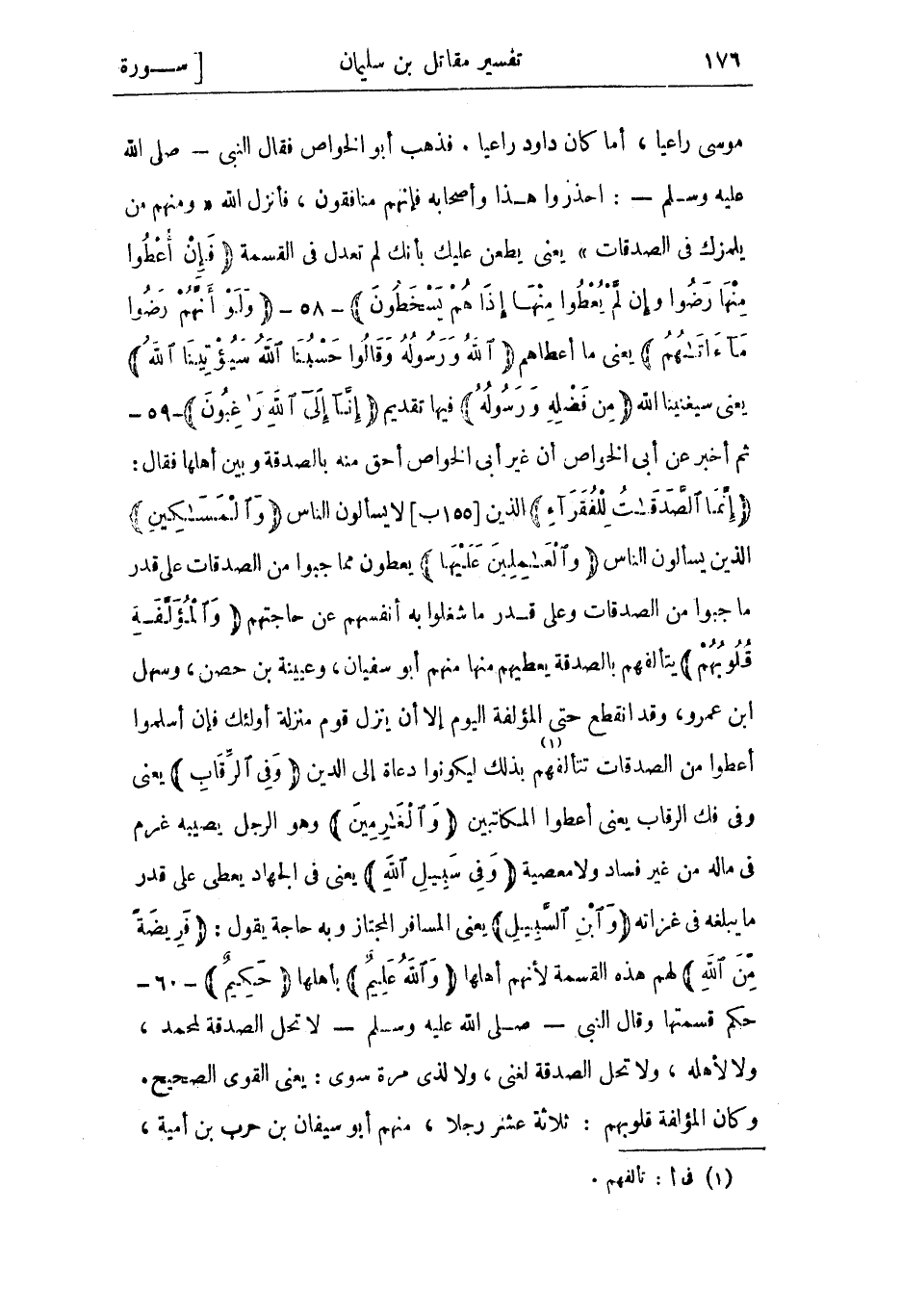 إِنَّمَا الصَّدَقاتُ لِلْفُقَراءِ الذين [155 ب] لا يسألون الناس وَالْمَساكِينِ الذين يسألون الناس وَالْعامِلِينَ عَلَيْها يعطون مما جبوا من الصدقات على قدر ما جبوا من الصدقات وعلى قدر ما شغلوا به أنفسهم عن حاجتهم وَالْمُؤَلَّفَةِ قُلُوبُهُمْ يتألفهم بالصدقة يعطيهم منها منهم أبو سفيان، وعيينة بن حصن، وسهل ابن عمرو، وقد انقطع حتى المؤلفة اليوم إلا أن ينزل قوم منزلة أولئك فإن أسلموا أعطوا من الصدقات تتألفهم «1» بذلك ليكونوا دعاة إلى الدين وَفِي الرِّقابِ يعني وفي فك الرقاب يعني أعطوا المكاتبين وَالْغارِمِينَ وهو الرجل يصيبه غرم في ماله من غير فساد ولا معصية وَفِي سَبِيلِ اللَّهِ يعني في الجهاد يعطى على قدر ما يبلغه في غزاته وَابْنِ السَّبِيلِ يعني المسافر المجتاز وبه حاجة يقول: فَرِيضَةً مِنَ اللَّهِ لهم هذه القسمة لأنهم أهلها وَاللَّهُ عَلِيمٌ بأهلها حَكِيمٌ- 60- حكم قسمتها