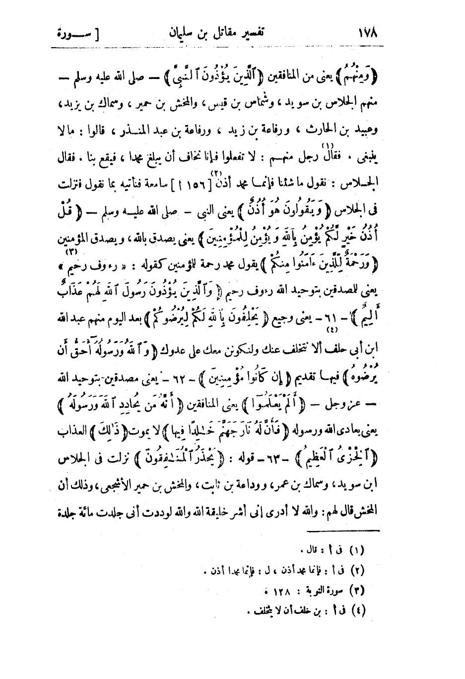وَمِنْهُمُ يعني من المنافقين الَّذِينَ يُؤْذُونَ النَّبِيَّ- صلى الله عليه وسلم- منهم الجلاس بن سويد، وشماس بن قيس، والمخش بن حمير، وسماك بن يزيد، وعبيد بن الحارث، ورفاعة بن زيد، ورفاعة بن عبد المنذر، قالوا: ما لا ينبغي. فقال «1» رجل منهم: لا تفعلوا فإنا نخاف أن يبلغ محمدا، فيقع بنا. فقال الجلاس: نقول ما شئنا فإنما محمد أذن «2» [156 أ] سامعة فنأتيه بما نقول فنزلت في الجلاس وَيَقُولُونَ هُوَ أُذُنٌ يعني النبي- صلى الله عليه وسلم- قُلْ أُذُنُ خَيْرٍ لَكُمْ يُؤْمِنُ بِاللَّهِ وَيُؤْمِنُ لِلْمُؤْمِنِينَ يعني يصدق بالله، ويصدق المؤمنين وَرَحْمَةٌ لِلَّذِينَ آمَنُوا مِنْكُمْ يقول محمد رحمة للمؤمنين كقوله: «رَؤُفٌ رَحِيمٌ» «3» يعنى للمصدقين بتوحيد الله رءوف رحيم وَالَّذِينَ يُؤْذُونَ رَسُولَ اللَّهِ لَهُمْ عَذابٌ أَلِيمٌ- 61- يعنى وجيع يَحْلِفُونَ بِاللَّهِ لَكُمْ لِيُرْضُوكُمْ بعد اليوم منهم عبد الله ابن أبي حلف «4» ألا نتخلف عنك ولنكونن معك على عدوك وَاللَّهُ وَرَسُولُهُ أَحَقُّ أَنْ يُرْضُوهُ فيها تقديم إِنْ كانُوا مُؤْمِنِينَ- 62- يعني مصدقين بتوحيد الله- عز وجل- أَلَمْ يَعْلَمُوا يعني المنافقين أَنَّهُ مَنْ يُحادِدِ اللَّهَ وَرَسُولَهُ يعني يعادي الله ورسوله فَأَنَّ لَهُ نارَ جَهَنَّمَ خالِداً فِيها لا يموت ذلِكَ العذاب الْخِزْيُ الْعَظِيمُ- 63- قوله: يَحْذَرُ الْمُنافِقُونَ نزلت فى الجلاس ابن سويد، وسماك بن عمر، ووداعة بن ثابت، والمخش بن حمير الأشجعى، وذلك أن المخش قال لهم: والله لا أدري إني أشر خليفة الله والله لوددت أني جلدت مائة جلدة