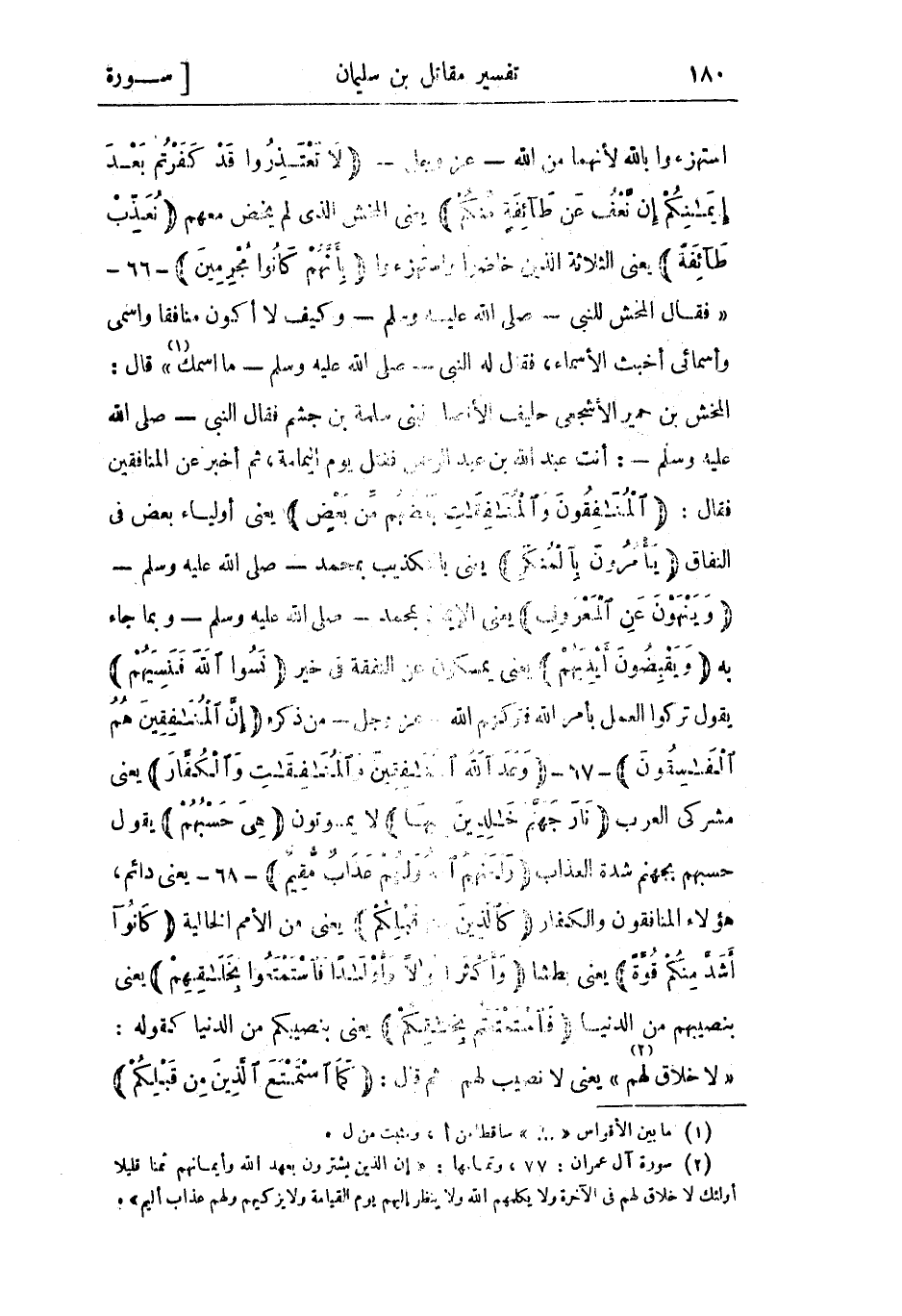 استهزءوا بالله لأنهما من الله- عز وجل- لا تَعْتَذِرُوا قَدْ كَفَرْتُمْ بَعْدَ إِيمانِكُمْ إِنْ نَعْفُ عَنْ طائِفَةٍ مِنْكُمْ يعنى المخش الذي لم يخض معهم نُعَذِّبْ طائِفَةً يعني الثلاثة الذين خاضوا واستهزءوا بِأَنَّهُمْ كانُوا مُجْرِمِينَ- 66-