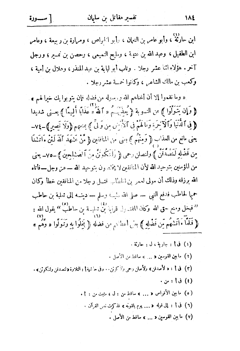 «وَما نَقَمُوا إِلَّا أَنْ أَغْناهُمُ اللَّهُ وَرَسُولُهُ مِنْ فَضْلِهِ فَإِنْ يَتُوبُوا يَكُ خَيْراً لَهُمْ» وَإِنْ يَتَوَلَّوْا عن التوبة يُعَذِّبْهُمُ «اللَّهُ» «2» عَذاباً أَلِيماً يعني شديدا فِي الدُّنْيا وَالْآخِرَةِ وَما لَهُمْ فِي الْأَرْضِ مِنْ وَلِيٍّ يمنعهم وَلا نَصِيرٍ- 74- يعني مانع من العذاب وَمِنْهُمْ يعني من المنافقين مَنْ عاهَدَ اللَّهَ لَئِنْ آتَانَا مِنْ فَضْلِهِ لَنَصَّدَّقَنَّ «3» ولنصلن رحمي وَلَنَكُونَنَّ مِنَ الصَّالِحِينَ «4» - 75- يعني من المؤمنين بتوحيد الله لأن المنافقين لا يخلصون بتوحيد الله- عز وجل- فأتاه الله برزقه وذلك أن مولى لعمر بن الخطاب قتل رجلا من المنافقين خطأ وكان حميما لحاطب فدفع النبي- صلى الله عليه وسلم- دينه إلى ثعلبة بن حاطب «فبخل ومنع حق الله وكان المقتول قرابة «5» بن ثعلبة بن حاطب «6» » يقول الله: