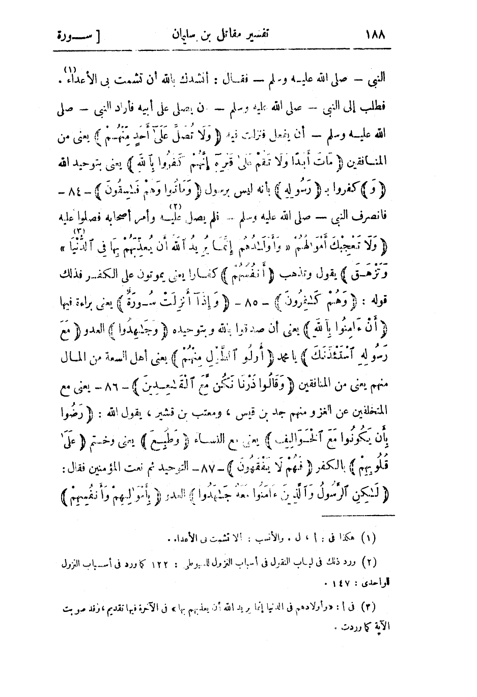 (3) فى أ: «وأولادهم فى الدنيا إِنَّمَا يُرِيدُ اللَّهُ أَنْ يُعَذِّبَهُمْ بِهَا» فِي الآخرة فيها تقديم، وقد صوبت الآية كما وردت.