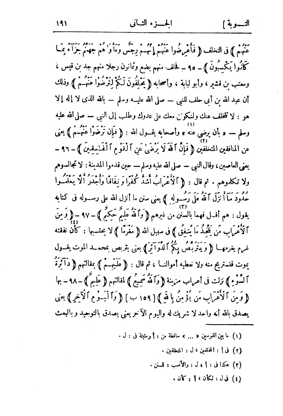 لِتُعْرِضُوا عَنْهُمْ في التخلف فَأَعْرِضُوا عَنْهُمْ إِنَّهُمْ رِجْسٌ وَمَأْواهُمْ جَهَنَّمُ جَزاءً بِما كانُوا يَكْسِبُونَ- 95- فحلف منهم بضع وثمانون رجلا منهم جد بن قيس، ومعتب بن قشير، وأبو لبابة، وأصحابه يَحْلِفُونَ لَكُمْ لِتَرْضَوْا عَنْهُمْ وذلك أن عبد الله بن أبي حلف للنبي- صلى الله عليه وسلم- بالله الذي لا إله إلا هو: لا نتخلف عنك ولنكونن معك على عدوك وطلب إلى النبي- صلى الله عليه وسلم- «بأن يرضى عنه «1» » وأصحابه يقول الله: فَإِنْ تَرْضَوْا عَنْهُمْ يعني عن المنافقين المتخلفين «2» فَإِنَّ اللَّهَ لا يَرْضى عَنِ الْقَوْمِ الْفاسِقِينَ- 96- يعنى العاصين،