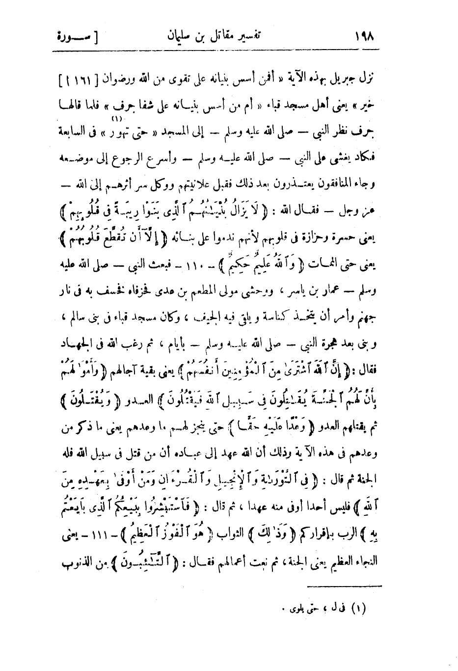 نزل جبريل بهذه الآية أَفَمَنْ أَسَّسَ بُنْيانَهُ عَلى تَقْوى مِنَ اللَّهِ وَرِضْوانٍ خَيْرٌ [161 أ] يعني أهل مسجد قباء أَمْ مَنْ أَسَّسَ بُنْيانَهُ عَلى شَفا جُرُفٍ فلما قالها جرف نظر النبي- صلى الله عليه وسلم- إلى المسجد «حتى تهور «1» » في السابعة فكاد يغشى على النبي- صلى الله عليه وسلم- وأسرع الرجوع إلى موضعه وجاء المنافقون يعتذرون بعد ذلك فقبل علانيتهم ووكل سر أثرهم إلى الله- عز وجل- فقال الله: لا يَزالُ بُنْيانُهُمُ الَّذِي بَنَوْا رِيبَةً فِي قُلُوبِهِمْ يعني حسرة وحزازة في قلوبهم لأنهم ندموا على بنائه إِلَّا أَنْ تَقَطَّعَ قُلُوبُهُمْ يعني حتى الممات وَاللَّهُ عَلِيمٌ حَكِيمٌ- 110- فبعث النبي- صلى الله عليه وسلم- عمار بن ياسر، ووحشي مولى المطعم بن عدى فخرفاه فخسف به في نار جهنم وأمر أن يتخذ كناسة ويلقي فيه الجيف، وكان مسجد قباء في بني سالم، وبني بعد هجرة النبي- صلى الله عليه وسلم- بأيام، ثم رغب الله في الجهاد فقال: إِنَّ اللَّهَ اشْتَرى مِنَ الْمُؤْمِنِينَ أَنْفُسَهُمْ يعني بقية آجالهم وَأَمْوالَهُمْ بِأَنَّ لَهُمُ الْجَنَّةَ يُقاتِلُونَ فِي سَبِيلِ اللَّهِ فَيَقْتُلُونَ العدو وَيُقْتَلُونَ ثم يقتلهم العدو وَعْداً عَلَيْهِ حَقًّا حتى ينجز لهم ما وعدهم يعني ما ذكر من وعدهم في هذه الآية وذلك أن الله عهد إلى عباده أن من قتل في سبيل الله فله الجنة ثم قال: فِي التَّوْراةِ وَالْإِنْجِيلِ وَالْقُرْآنِ وَمَنْ أَوْفى بِعَهْدِهِ مِنَ اللَّهِ فليس أحدا أوفى منه عهدا، ثم قال: فَاسْتَبْشِرُوا بِبَيْعِكُمُ الَّذِي بايَعْتُمْ بِهِ الرب بإقراركم وَذلِكَ الثواب هُوَ الْفَوْزُ الْعَظِيمُ- 111- يعني النجاء العظيم يعني الجنة، ثم نعت أعمالهم فقال: التَّائِبُونَ من الذنوب