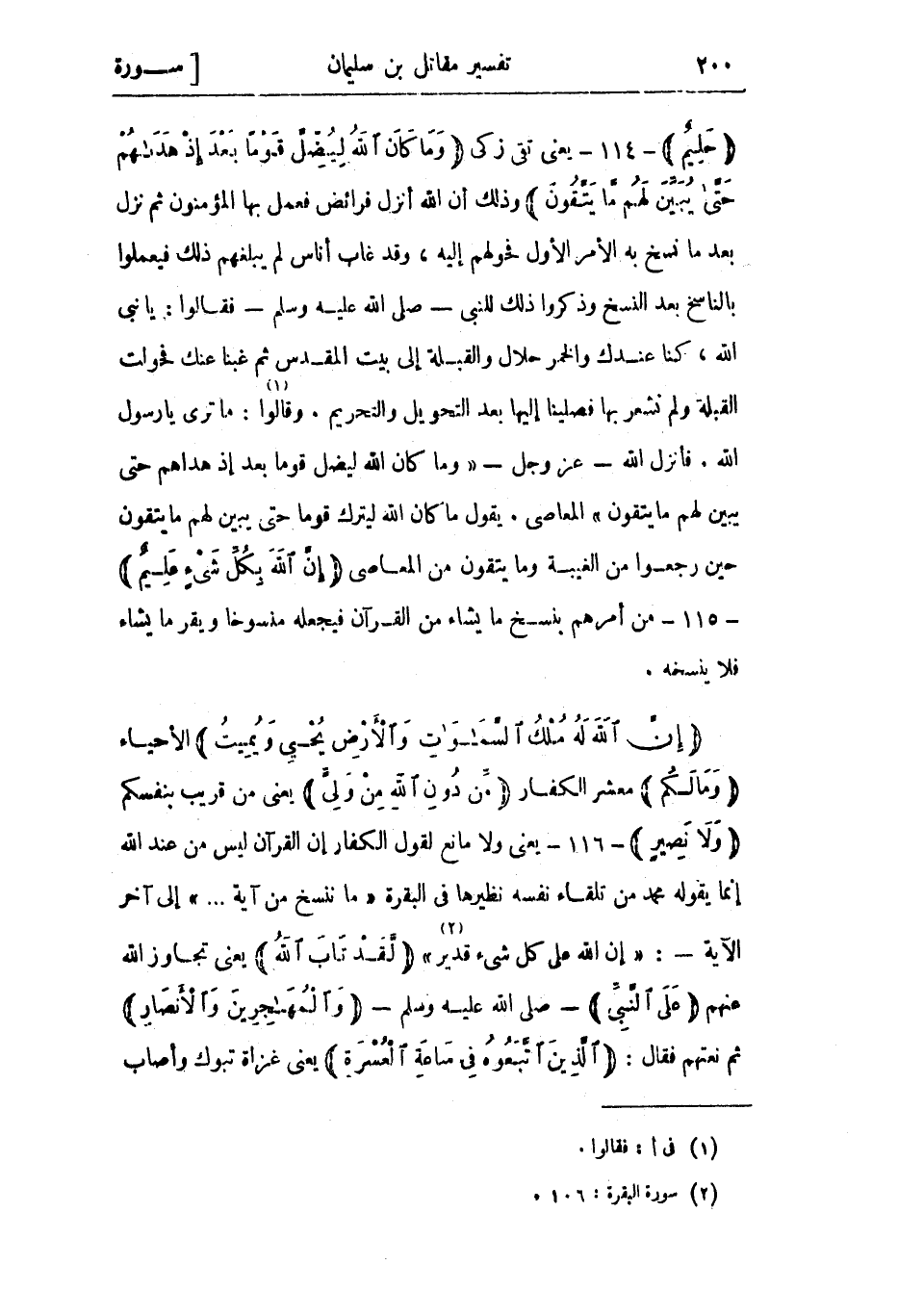 حَلِيمٌ- 114- يعني تقي زكي وَما كانَ اللَّهُ لِيُضِلَّ قَوْماً بَعْدَ إِذْ هَداهُمْ حَتَّى يُبَيِّنَ لَهُمْ ما يَتَّقُونَ وذلك أن الله أنزل فرائض فعمل بها المؤمنون ثم نزل بعدُ ما نسخ به الأمر الأول فحولهم إليه، وقد غاب أناس لم يبلغهم ذلك فيعملوا بالناسخ بعد النسخ وذكروا ذلك للنبي- صلى الله عليه وسلم- فقالوا: يا نبي الله، كنا عندك والخمر حلال والقبلة إلى بيت المقدس ثم غبنا عنك فحولت القبلة ولم نشعر بها فصلينا إليها بعد التحويل والتحريم. وقالوا «1» : ما ترى يا رسول الله. فأنزل الله- عز وجل- «وَما كانَ اللَّهُ لِيُضِلَّ قَوْماً بَعْدَ إِذْ هَداهُمْ حَتَّى يُبَيِّنَ لَهُمْ ما يَتَّقُونَ»