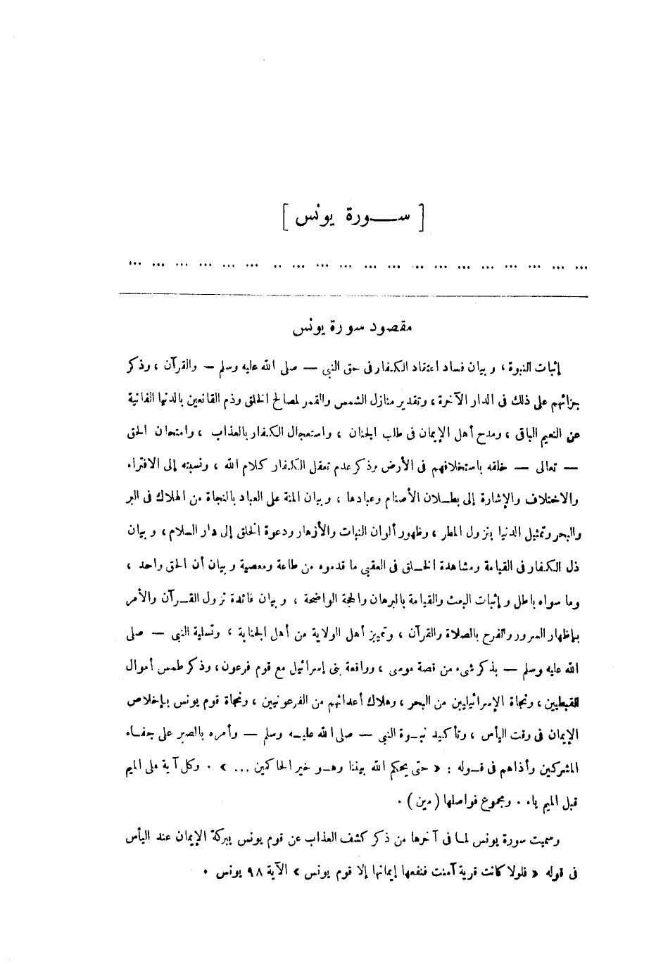 (1) مقصود سورة يونس إثبات النبوة، وبيان فساد اعتقاد الكفار فى حق النبي- صلى الله عليه وسلم- والقرآن، وذكر جزائهم على ذلك فى الدار الآخرة، وتقدير منازل الشمس والقمر لمصالح الخلق وذم القانعين بالدنيا الفانية عن النعيم الباقي، ومدح أهل الإيمان فى طلب الجنان، واستعجال الكفار بالعذاب، وامتحان الحق- تعالى- خلقه باستخلافهم فى الأرض وذكر عدم تعقل الكفار كلام الله، ونسبته إلى الافتراء والاختلاف والإشارة إلى بطلان الأصنام وعبادها، وبيان المنة على العباد بالنجاة من الهلاك فى البر والبحر وتمثيل الدنيا بنزول المطر، وظهور ألوان النبات والأزهار ودعوة الخلق إلى دار السلام، وبيان ذل الكفار فى القيامة ومشاهدة الخلق فى العقبى ما قدموه من طاعة ومعصية وبيان أن الحق واحد، وما سواه باطل وإثبات البعث والقيامة بالبرهان والحجة الواضحة، وبيان فائدة نزول القرآن والأمر بإظهار السرور والفرح بالصلاة والقرآن، وتمييز أهل الولاية من أهل الجناية، وتسلية النبي- صلى الله عليه وسلم- بذكر شيء من قصة موسى، وواقعة بنى إسرائيل مع قوم فرعون، وذكر طمس أموال القبطيين، ونجاة الإسرائيليين من البحر، وهلاك أعدائهم من الفرعونيين، ونجاة قوم يونس بإخلاص الإيمان فى وقت اليأس، وتأكيد نبوة النبي- صلى الله عليه وسلم- وأمره بالصبر على جفاء المشركين وأذاهم فى قوله: حَتَّى يَحْكُمَ اللَّهُ بَيْنَنا وَهُوَ خَيْرُ الْحاكِمِينَ.... وكل آية على الميم قبل الميم ياء. ومجموع فواصلها (مين) .