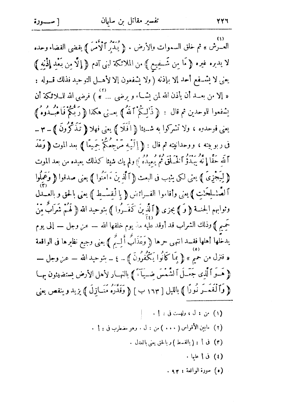 «إِلَّا مِنْ بَعْدِ أَنْ يَأْذَنَ اللَّهُ لِمَنْ يَشاءُ وَيَرْضى ... «2» » ) فرضي الله للملائكة أن يشفعوا للموحدين ثم قال: ذلِكُمُ اللَّهُ يعني هكذا رَبُّكُمْ فَاعْبُدُوهُ يعني فوحدوه، ولا تشركوا به شيئا أَفَلا يعني فهلا تَذَكَّرُونَ- 3- في ربوبيته، ووحدانيته ثم قال: إِلَيْهِ مَرْجِعُكُمْ جَمِيعاً بعد الموت وَعْدَ اللَّهِ حَقًّا إِنَّهُ يَبْدَؤُا الْخَلْقَ ثُمَّ يُعِيدُهُ ولم يك شيئا كذلك يعيده من بعد الموت لِيَجْزِيَ يعني لكي يثيب في البعث الَّذِينَ آمَنُوا يعني صدقوا وَعَمِلُوا الصَّالِحاتِ يعني وأقاموا الفرائض بِالْقِسْطِ يعني بالحق وبالعدل «3» وثوابهم الجنة وَيجزى الَّذِينَ كَفَرُوا بتوحيد الله لَهُمْ شَرابٌ مِنْ حَمِيمٍ وذلك الشراب قد أوقد عليه «4» منذ يوم خلقها الله- عز وجل- إلى يوم يدخلها أهلها فقد انتهى حرها وَعَذابٌ أَلِيمٌ يعني وجيع نظيرها في الواقعة فَنُزُلٌ مِنْ حَمِيمٍ «5» بِما كانُوا يَكْفُرُونَ- 4- بتوحيد الله- عز وجل- هُوَ الَّذِي جَعَلَ الشَّمْسَ ضِياءً بالنهار لأهل الأرض يستضيئون بها وَالْقَمَرَ نُوراً بالليل [163 ب] وَقَدَّرَهُ مَنازِلَ يزيد وينقص يعنى