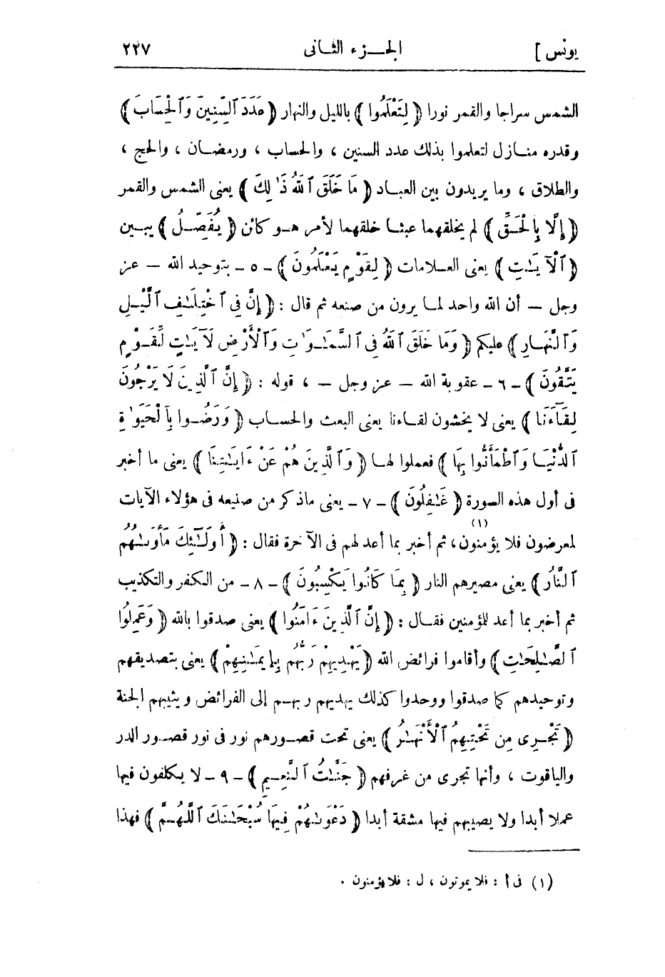 الشمس سراجا والقمر نورا لِتَعْلَمُوا بالليل والنهار عَدَدَ السِّنِينَ وَالْحِسابَ وقدره منازل لتعلموا بذلك عدد السنين، والحساب، ورمضان، والحج، والطلاق، وما يريدون بين العباد ما خَلَقَ اللَّهُ ذلِكَ يعني الشمس والقمر إِلَّا بِالْحَقِّ لم يخلقهما عبثا خلقهما لأمر هو كائن يُفَصِّلُ يبين الْآياتِ يعني العلامات لِقَوْمٍ يَعْلَمُونَ- 5- بتوحيد الله- عز وجل- أن الله واحد لما يرون من صنعه ثم قال: إِنَّ فِي اخْتِلافِ اللَّيْلِ وَالنَّهارِ عليكم وَما خَلَقَ اللَّهُ فِي السَّماواتِ وَالْأَرْضِ لَآياتٍ لِقَوْمٍ يَتَّقُونَ- 6- عقوبة الله- عز وجل-، قوله: إِنَّ الَّذِينَ لا يَرْجُونَ لِقاءَنا يعني لا يخشون لقاءنا يعني البعث والحساب وَرَضُوا بِالْحَياةِ الدُّنْيا وَاطْمَأَنُّوا بِها فعملوا لها وَالَّذِينَ هُمْ عَنْ آياتِنا يعنى ما أخبر فى أول هذه السورة غافِلُونَ- 7- يعني ما ذكر من صنيعه في هؤلاء الآيات لمعرضون فلا يؤمنون «1» ، ثم أخبر بما أعد لهم في الآخرة فقال: أُولئِكَ مَأْواهُمُ النَّارُ يعنى مصيرهم النار بِما كانُوا يَكْسِبُونَ- 8- من الكفر والتكذيب ثم أخبر بما أعد للمؤمنين فقال: إِنَّ الَّذِينَ آمَنُوا يعني صدقوا بالله وَعَمِلُوا الصَّالِحاتِ وأقاموا فرائض الله يَهْدِيهِمْ رَبُّهُمْ بِإِيمانِهِمْ يعني بتصديقهم وتوحيدهم كما صدقوا ووحدوا كذلك يهديهم ربهم إلى الفرائض ويثيبهم الجنة تَجْرِي مِنْ تَحْتِهِمُ الْأَنْهارُ يعني تحت قصورهم نور في نور قصور الدر والياقوت، وأنها تجري من غرفهم جَنَّاتِ النَّعِيمِ- 9- لا يكلفون فيها عملا أبدا ولا يصيبهم فيها مشقة أبدا دَعْواهُمْ فِيها سُبْحانَكَ اللَّهُمَّ فهذا